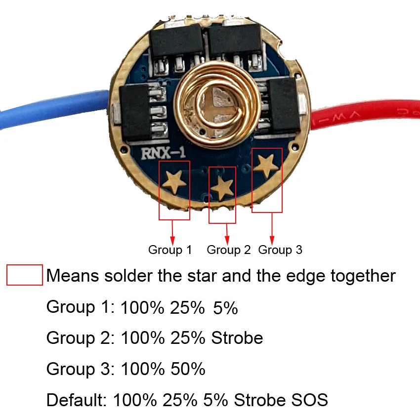 Default(Means don't solder anything): 100% 25% 5% Strobe SOS