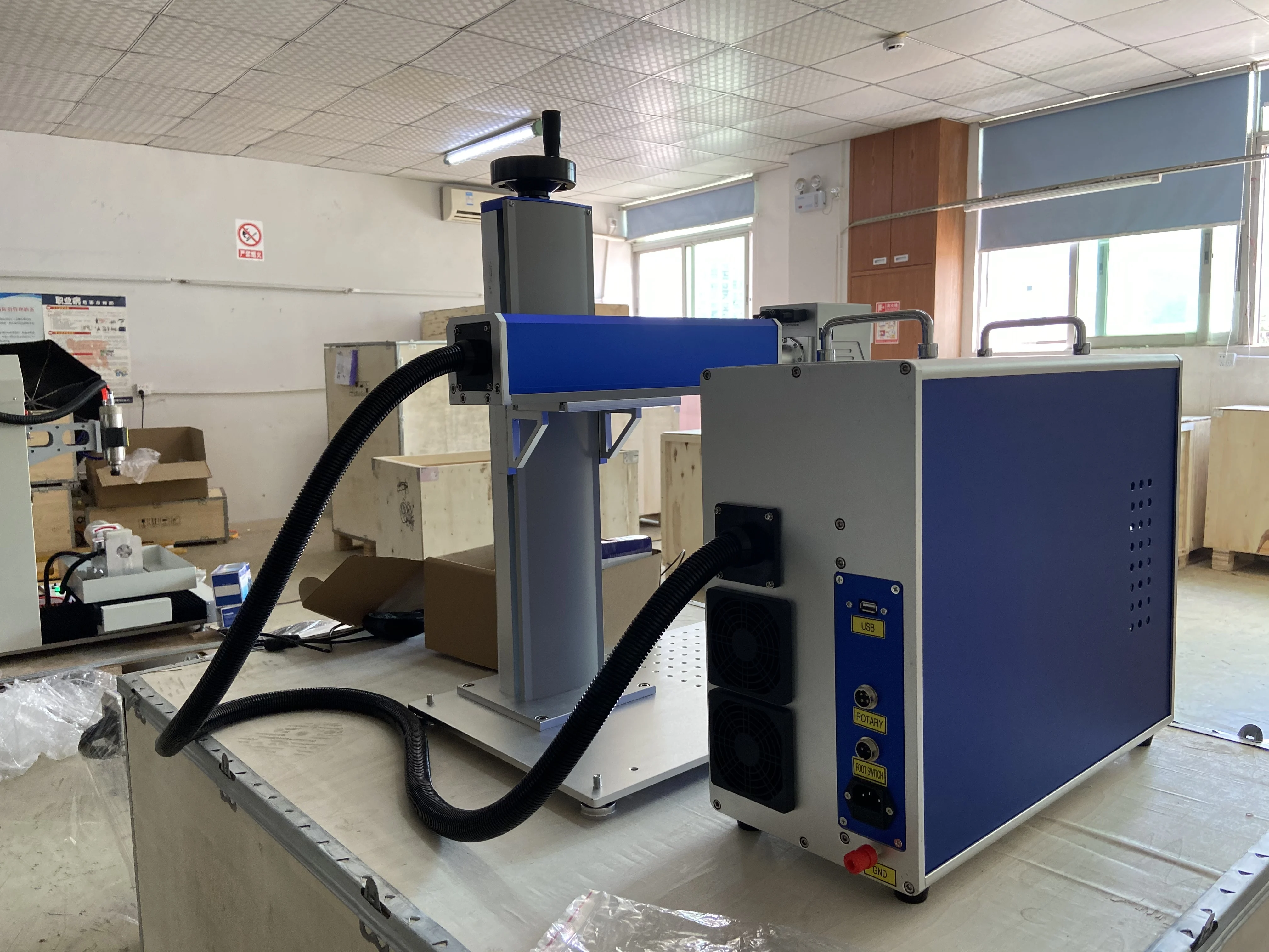 Волоконно-лазерная маркировочная машина в основном состоит из четырех частей:Волоконный лазер, Система сканирования гальванометра, компьютерная система управления и рабочий стол.