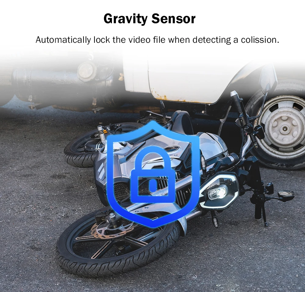 Питание от аккумуляторной батареи мотоцикла никогда не нужно заряжать. Не нужно беспокоиться о проблемах с зарядкой. Видеорегистратор не разряжает батарею. Он автоматически выключается, когда напряжение батареи ниже 11,8 V.