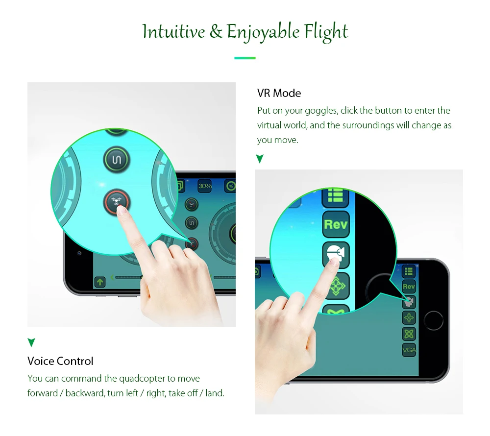 ● Интуитивно понятное приложение делает режим G-сенсора, Waypoints, голосовое управление, режим VR и так далее легко доступным