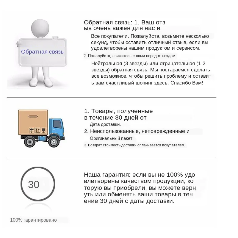 Чтобы сделать покупателя наиболее удовлетворенным. Мы предоставляем политику возврата. Вы можете отправить товар обратно для возврата (стоимость доставки не возвращается) или обмена.