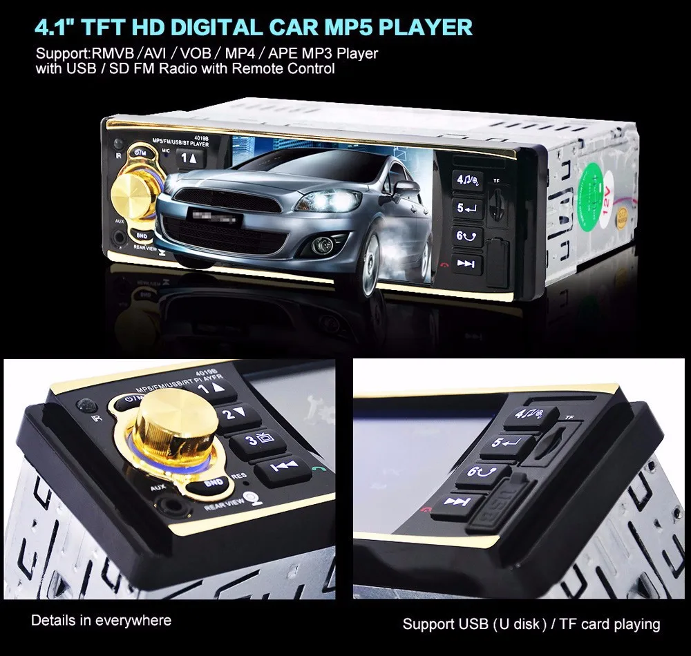 Технические характеристики Цвет Черный Формат цифровых медиа DVD-R/RW Разрешение 800x480 Специальные Особенности Bluetooth, зарядное устройство, fm-передатчик Размеры и вес Вес продукта 0,5480 кг Вес упаковки 0,6840 кг Размер упаковки (Д x Ш x В) 21,00x18,00x9,00 см/8,27x7,09x3,54 дюйма Содержимое упаковки Содержимое упаковки Автомобильный MP5 плеер-1 шт., руководство пользователя на английском языке-1 шт., пульт дистанционного управления-2 шт., кабель-4 шт., винт-2 шт., камера-1 шт.