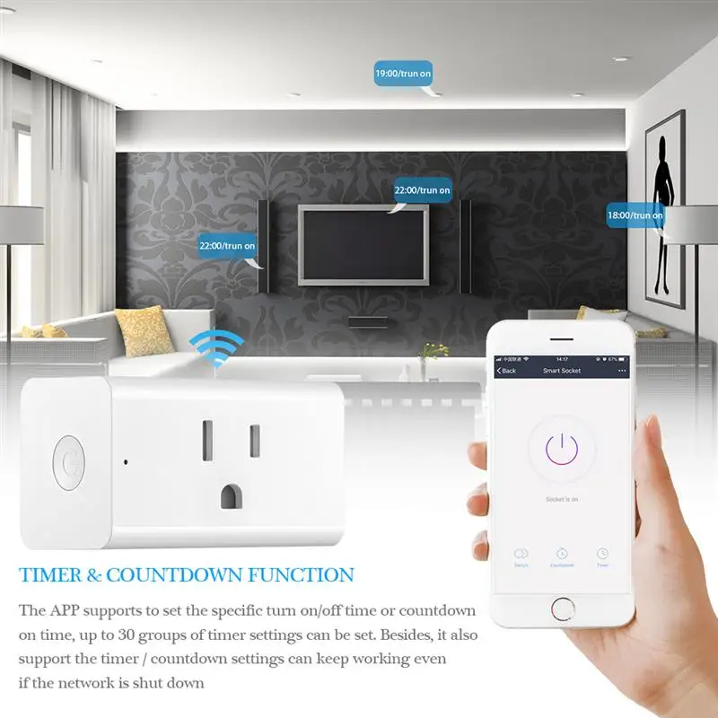 Пользователь может использовать смартфон для удаленного управления включением/выключением домашней электроники в любое время и в любом месте с помощью приложения до тех пор, пока телефон имеет сеть 2G/3G/4G/WIFI. С этим гнездом Wi-Fi пользователю не нужно беспокоиться о том, забыть ли выключить свет после выхода из дома.