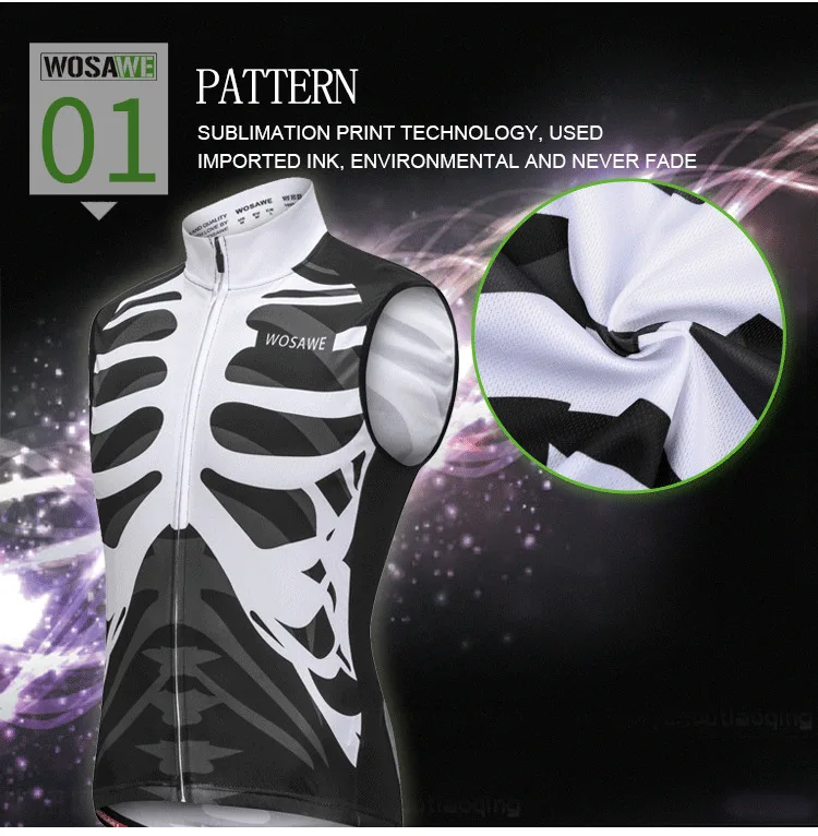 Дизайн без рукавов для поездок в жаркую погодуОтборная сетчатая ткань Эффективная передача влаги для прохладного и сухого комфорта при ездеСетчатые вставки подмышкамиПолная длина потайная застежка-молнияWOSAWE захват эластичный на нижней кромке держать Джерси на месте3 отсека задние карманы для хранения предметов первой необходимости2 светоотражающие полосы для обеспечения безопасности ночной езды