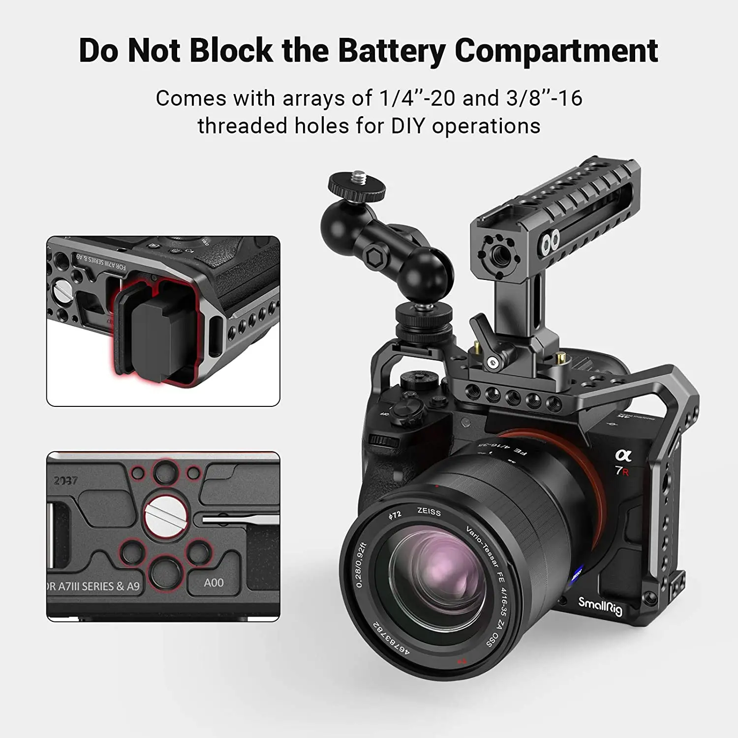 1. Он предназначен исключительно для Sony A7RIII/A7III. Клетка 2087 не блокирует доступ к отсеку батареи, портам и слотам камеры и поставляется с несколькими резьбовыми отверстиями для внешних креплений.