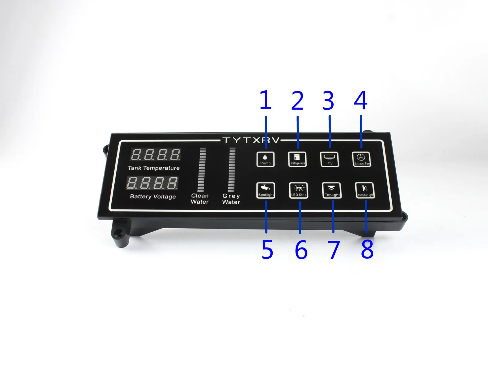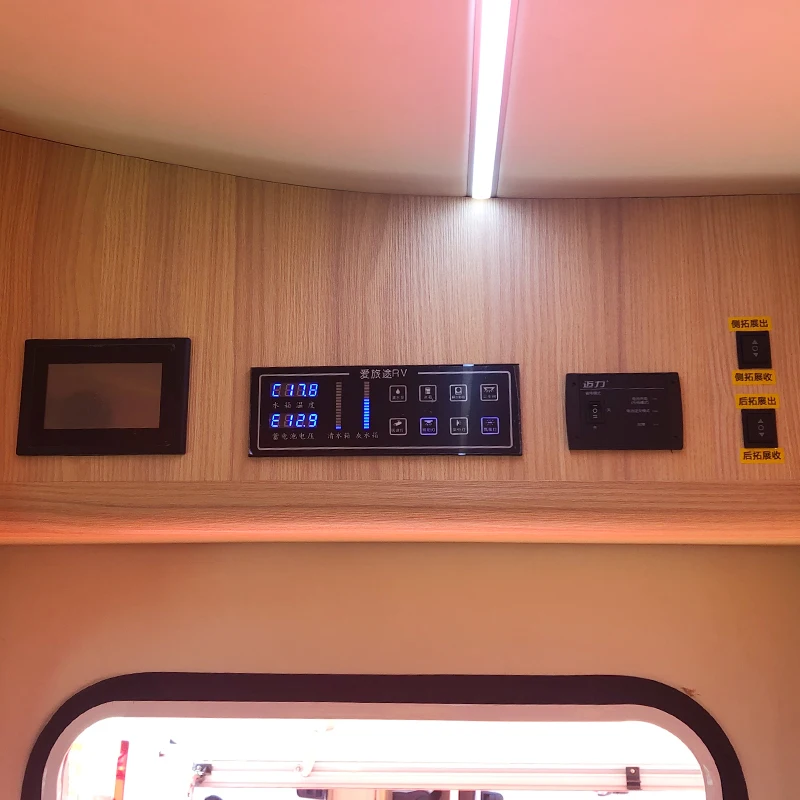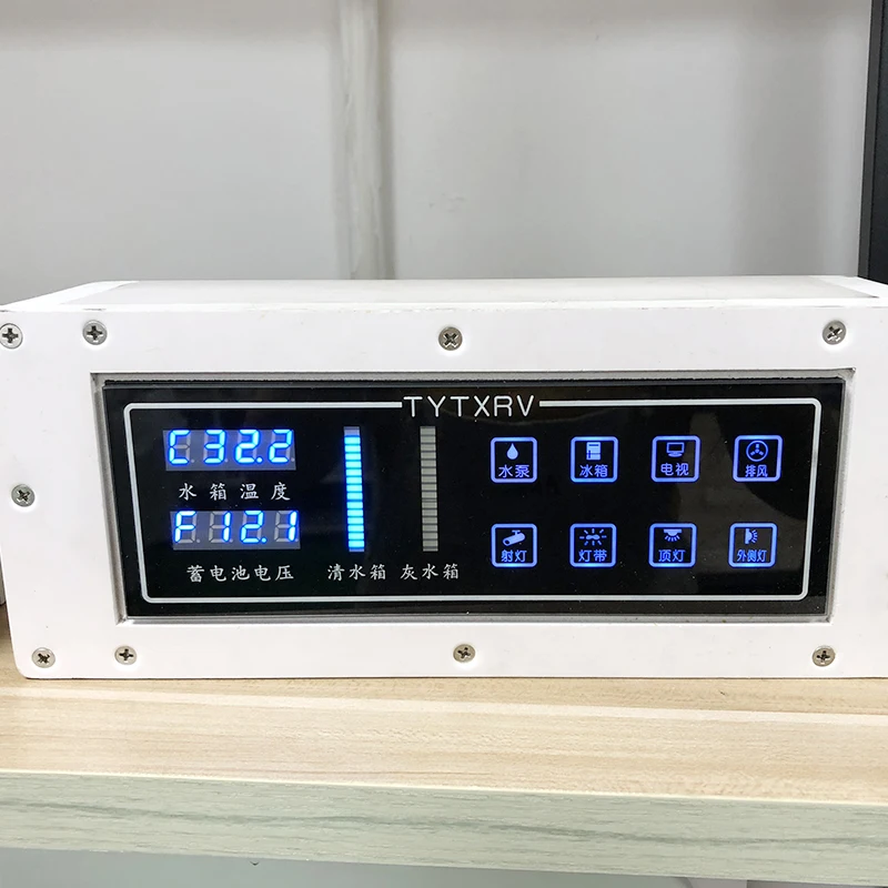Дисплей температуры бака: 1. Резервуар для чистой воды (C28.5)2. Серый резервуар для воды (H28.5) Дисплей напряжения батареи: Вторичное напряжение батареи (F12.8) Напоминание о звуке: 1. При низком уровне резервуара для чистой воды; 2. При высоком уровне серого резервуара для воды; 3. В тех случаях, когда напряжение батареи ниже, чем 10,5 V/21V; Защита насоса: когда резервуар для воды не имеет воды, насос автоматически отключается через пять минут; Функция кнопки Кнопка 1: Нажмите 3 секунды, переключите температуру резервуара для воды, C = бак для чистой воды, H = серый Резервуар для воды; Кнопка 2: Нажмите 3 секунды, выключите или откройте зуммер, b ON = открыть зуммер, b OFF = выключить Звуковой сигнал; Кнопка 5: Нажмите 3 секунды, переключите двойное напряжение батареи, F = Второе напряжение батареи, E = Main Напряжение батареи; Кнопка 8: Нажмите 3 секунды, откройте или выключите светильник панели, можно закрыть ночью;