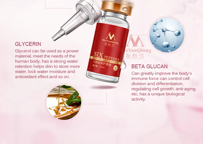 Шесть пептидов без какой-либо токсичности, не нуждаются в инъекциях, могут перехватить мышечное сокращение сигнала, снижение силы сокращения мышц, сокращение числа динамических линий и устранение тонких линий, может эффективно реорганизовать коллагеновый эластин, увеличить активность эластина, расслабиться линии лица, разглаживать морщины.