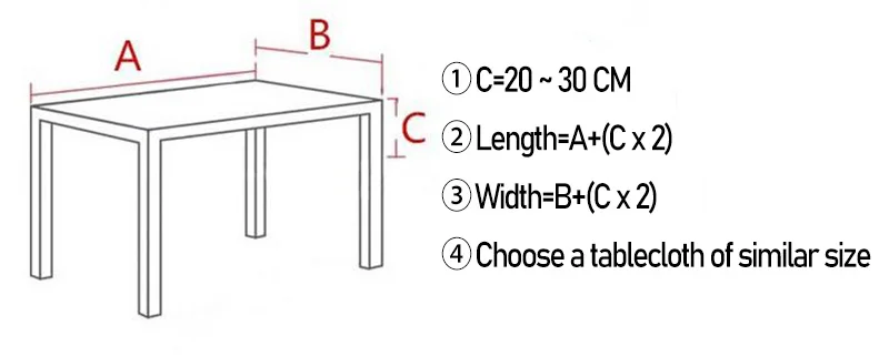 1. C = 20 ~ 30 см 2. Длина = A +(C * 2) 3. Ширина = B +(C * 2) 4. Выберите скатерть аналогичного размера