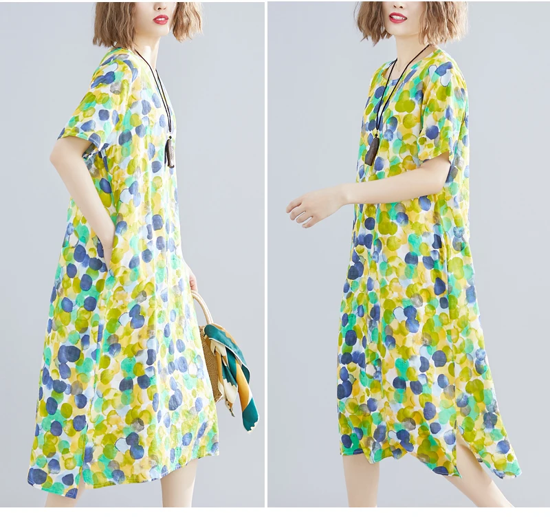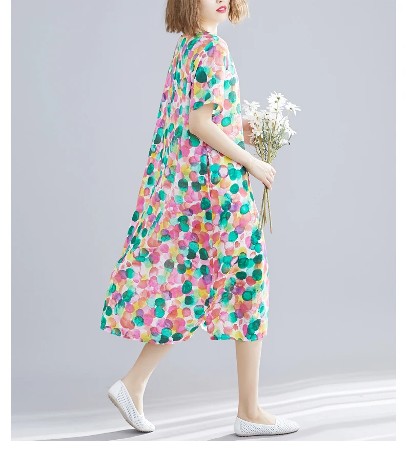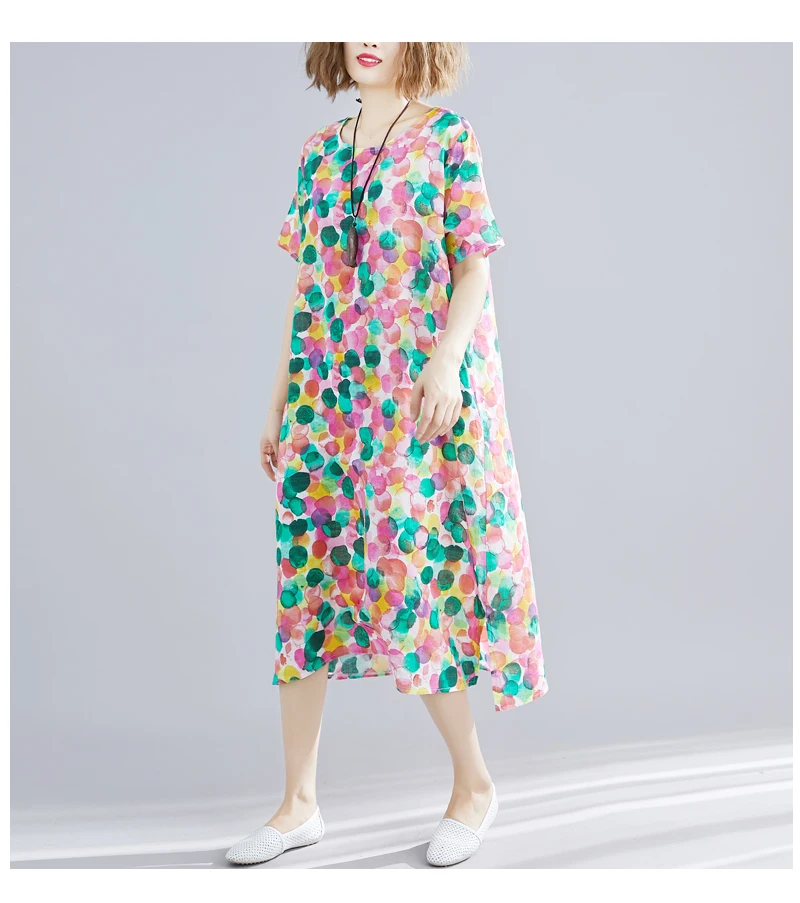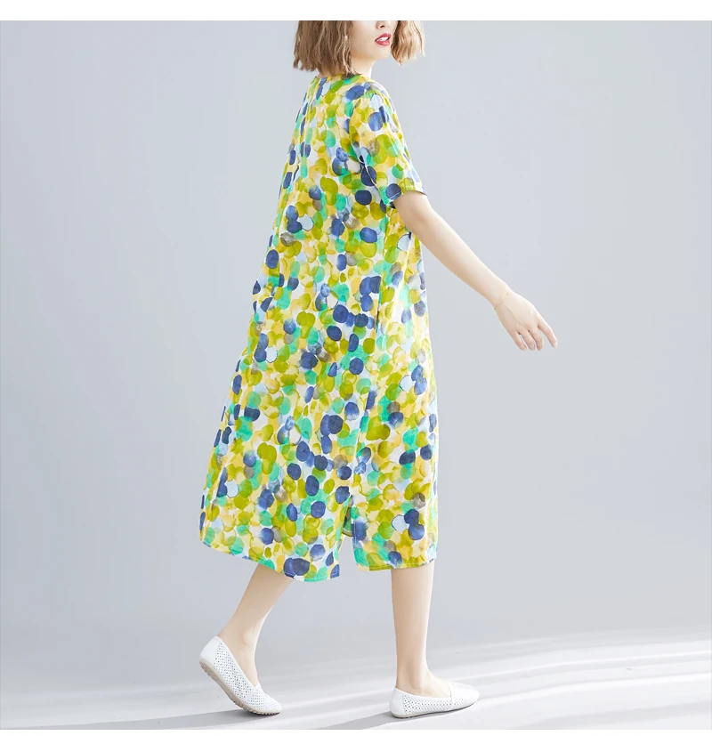 2021 Новое летнее платье с коротким рукавом из хлопка и льна, женская одежда, платье до середины икры размера плюс, приталенные платья с абстрактным принтом в горошек