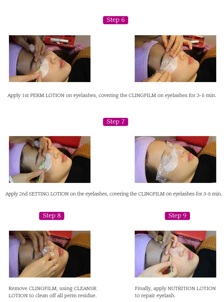 6) Снимите Пермь лосьон #1 с Y кисть, затем нанесите закрепитель #2 на ресницы, а затем закройте глаза с полиэтиленовой пленкой. (Время зарядки: 5-8 минут)