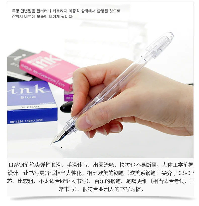 Эти ручки и ручки доступны в разных стилях из Европы и Японии. Это ручка, подходящая для повседневного письма и предназначенная для студентов как ручка для практики письма. Гладкое, удлиненное тело имеет треугольное сцепление, чтобы поощрить хорошую форму письма. Чистый баррель отображает уровни чернил и имеет почти чистую окраску.