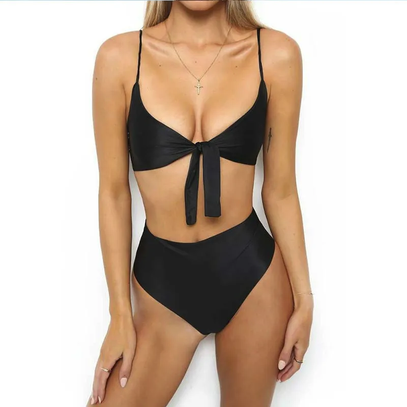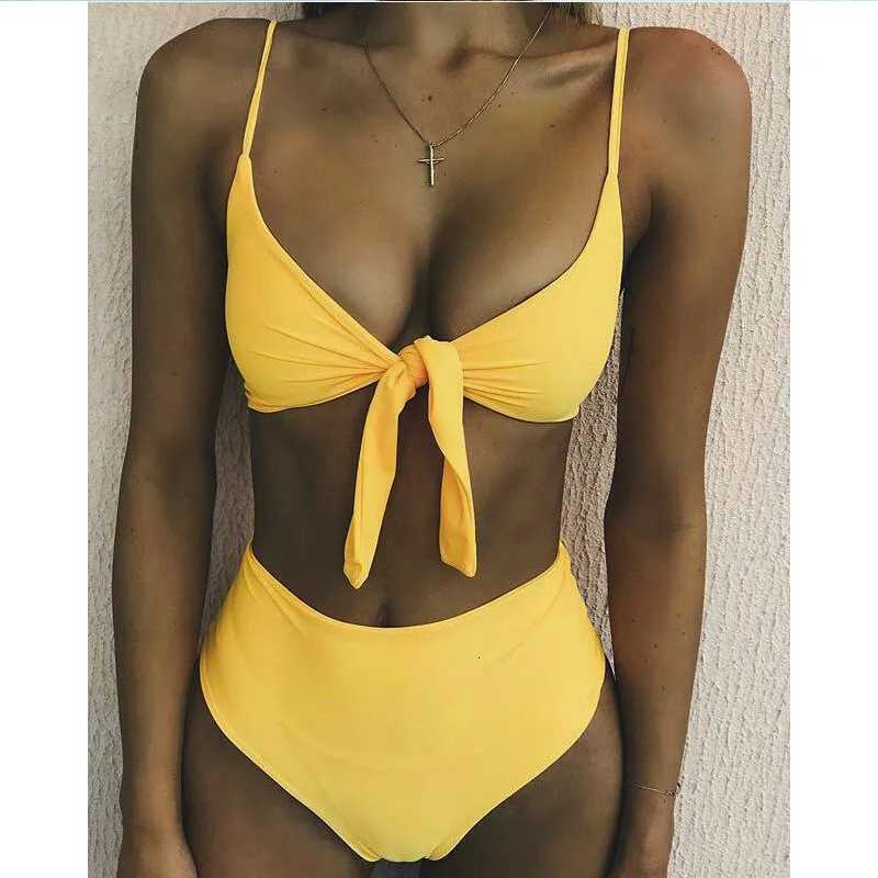 2018 горячая Распродажа, сексуальное бикини, 2 предмета, женский купальник с высокой талией, Мягкий купальник, однотонный, красный, желтый, черный, с завязками спереди, бикини для девочек