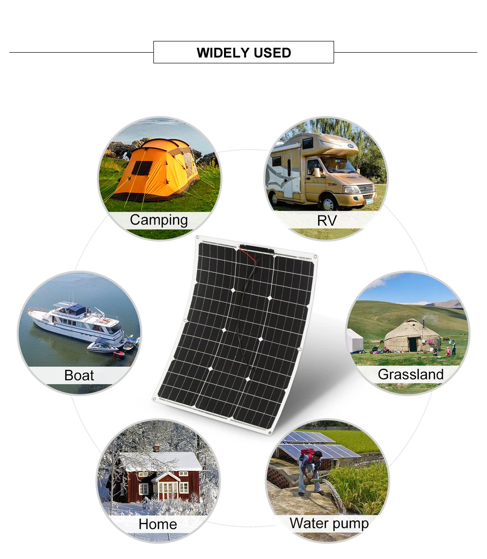 Гибкость: может быть согнута до 30 градусов и может быть применена к неправильным поверхностям, таким как крыши RV, лодки, палатки, сводчатые крыши и т. Д. Маленький размер: из-за небольшого размера, его нелегко повредить во время транспортировки. Подходит для использования в условиях недостаточного пространства. Светильник вес: только 1,5 мм толщиной, весит 1,1 кг, легко повесить, разобрать и носить с собой. Простота установки: металлические отверстия в углах изделия для фиксации винтов и крепления. Контроллер может использоваться только с аккумуляторами, кабели должны быть приобретены самостоятельно.