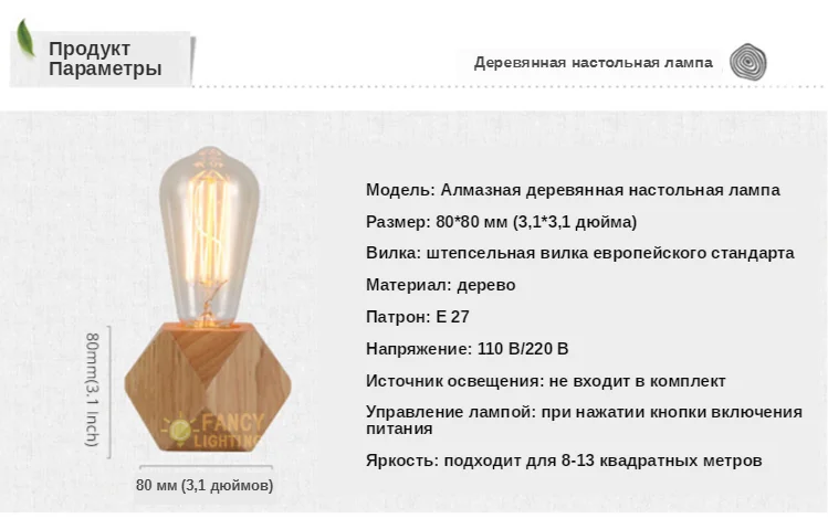 Размер: 80*80 мм (3,1*3,1 дюйма) Вилка: штепсельная вилка европейского стандарта Основной материал: дерево Напряжение: 110 В/220 В Управление лампой: Коснувшись Кнопки включения