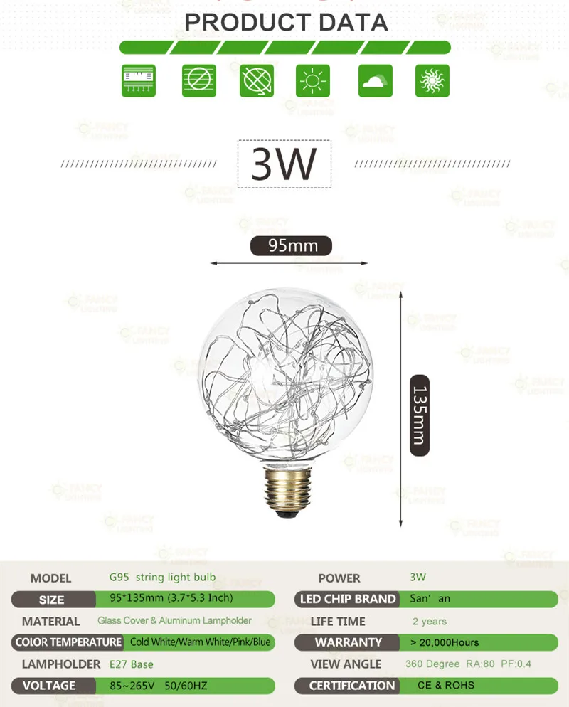 Размер: 95*135 мм (3,7*5,3 дюймов) Мощность: 3 Вт Держатель лампы: E27 Напряжение: 85-265 В переменного тока Цветовая температура: холодный белый