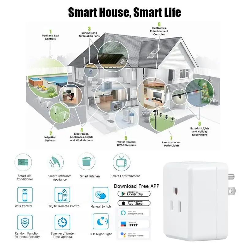 Wi-Fi умная розетка Smart Home Plug App Remote control Home техника с Amazon Alexa Google Home IFTTT график синхронизации обратного отсчета для смартфонов WiFi умная розетка, умный дом, делая вашу жизнь более удобной. После работы, яркие огни, приготовленная еда, ванна горячей воды ждут вас, это счастье? Вы думаете, что можно выключить свет, прежде чем лечь спать? Умный штекер может помочь вам решить эту проблему. Вы можете создать график для каждого устройства в любой день недели, или настроить его по определенному времени в день. Заставьте ваши устройства работать в Вашем графике. Кроме того, Экономьте деньги, управляя устройствами по вашему графику. Вы знаете, что большинство бытовой техники не в использовании, а все еще тратит энергию? С помощью smart Wi-Fi plug, вы не должны платить дополнительное электричество. Можно включить переключатель при необходимости, иначе выключается. И вы можете делать это где угодно и в любое время. Особенности: Технология Wi-Fi и интеллектуальное управление приложениями:Принимает 2,4 г Wi-Fi технологии и интеллектуальное приложение дистанционного управления, после установки подключения, смартфон/планшет можно удаленно включать/выключать бытовую технику в любое время и где угодно через приложение с 2,4 г Wi-Fi/4 г/3g network (вы можете легко скачать приложение из приложения store google Android или iOS). Работать с Amazon Alexa и Google Home & IFTTT:Вы можете просто управлять системой Wi-Fi smart socket ON/OFF через Amazon Alexa, google Home или IFTTT голосовой контроль дома, делая вашу жизнь более удобной и более умной (Примечание: только можно контролировать/выключаться через Amazon Alexa/Google Home Voice control). Планирование и функция обратного отсчета поддерживаются:Приложение поддерживает несколько настроек синхронизации. Установите определенный поворот и Выключите время для бытовой техники, чтобы сделать вашу технику запускать на ваше расписание, даже когда тебя там нет. Функция обратного отсчета позволяет планировать время для включения/выключения техники заранее (можно установить индекс цикла), предупреждение мощности отходов и чрезмерная зарядка. Простая установка и мультиплеер управления:Все, что вам нужно сделать, это настроить Wi-Fi Smart Plug с WiFi сети, подключайте и Регистрируйте бытовую технику. Кроме того, один Смартфон может управлять несколькими умными розетками (в зависимости от несущей способности роутера в практическом использовании), и одну розетку можно контролировать несколькими смартфонами. Многоцелевой дизайн:Совместим с Android/iOS-смартфонами и планшетами. Поддержка 2,4 г WiFi и AC100-240V Напряжение. Идеально подходит для контроля самой бытовой техники, такой как, электрический вентилятор, лампа, электрическая плита, кондиционер, водонагреватель, электрический вентилятор, Телевизор, увлажнитель воздуха и другая техника с предустановленной функцией включения/выключения. Основные моменты: * Расширенный Smart Switch:Можно работать с Amazon Alexa, Google Home и IFTTT (короткая для если это то). Добавить больше функций с IFTTT:"Если это, затем, что "является бесплатным веб-сервисом, который позволяет делать удивительные вещи с Умной сокетом. Поворотники, кофеварки, вентиляторы и другая электроника, когда вы почти дома или выключены, когда вы уходите. С IFTTT, умная розетка может даже установить свет, чтобы включить автоматически, когда вы открываете гараж. * Планирования:Автоматически включать/выключать ваши устройства на 