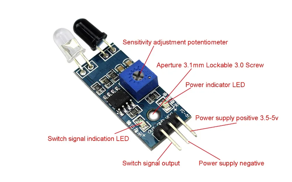 Модуль датчика адаптируется к окружающему светильник, имеющий пару инфракрасных излучателей и приемных трубок, передающих трубок излучают инфракрасную определенную частоту, при обнаружении направления препятствия (отражающая поверхность), инфракрасное отражение получено приемной трубкой, после обработки схемы компаратора зеленый светильник включен, Но выходной интерфейс сигнала выводит цифровой сигнал (низкоуровневый сигнал), вы можете отрегулировать регулятор расстояния обнаружения потенциометра, эффективный диапазон расстояния 2 ~ 30 см, рабочее напряжение 3,3 V- 5V. Диапазон обнаружения датчика может быть получен через регулировочный потенциометр, с небольшими помехами, легко собирается, прост в использовании, может быть широко использован в избегании препятствий робота, избегании автомобиля, подсчет линии, И черно-белая линия отслеживания и много других случаев.