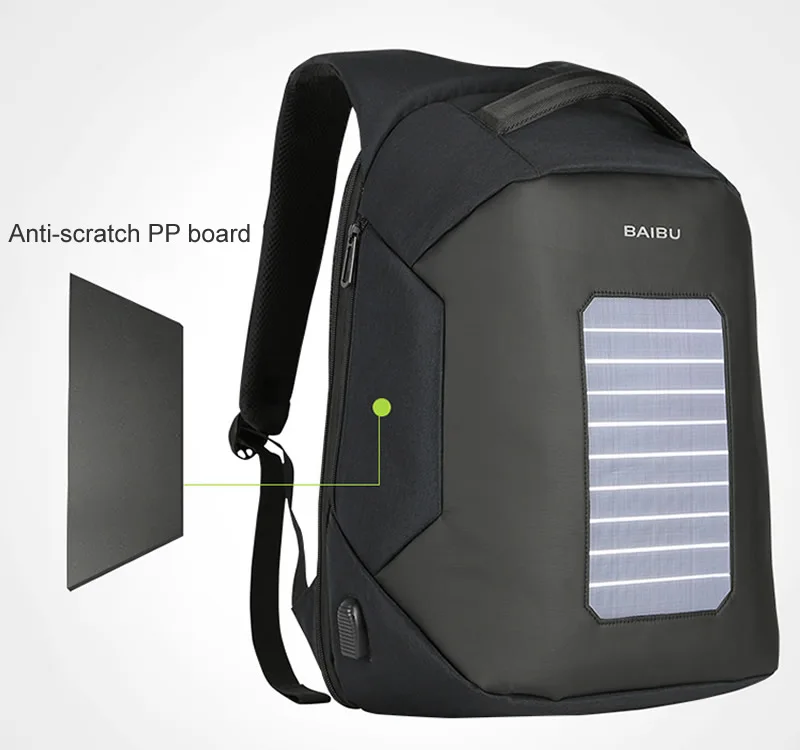 Стиль продукта: перезаряжаемый рюкзак для деловых поездок Материал ткани: текстиль Oxford Подкладка: полиэстер Цвет: черный/серый/синий/красный Размер: ширина 32 x Толщина 18 x высота 48 (см) Вес: около 1,13 кг Выходная мощность солнечной батареи: 5,3 Вт выходной ток