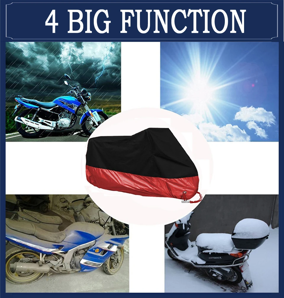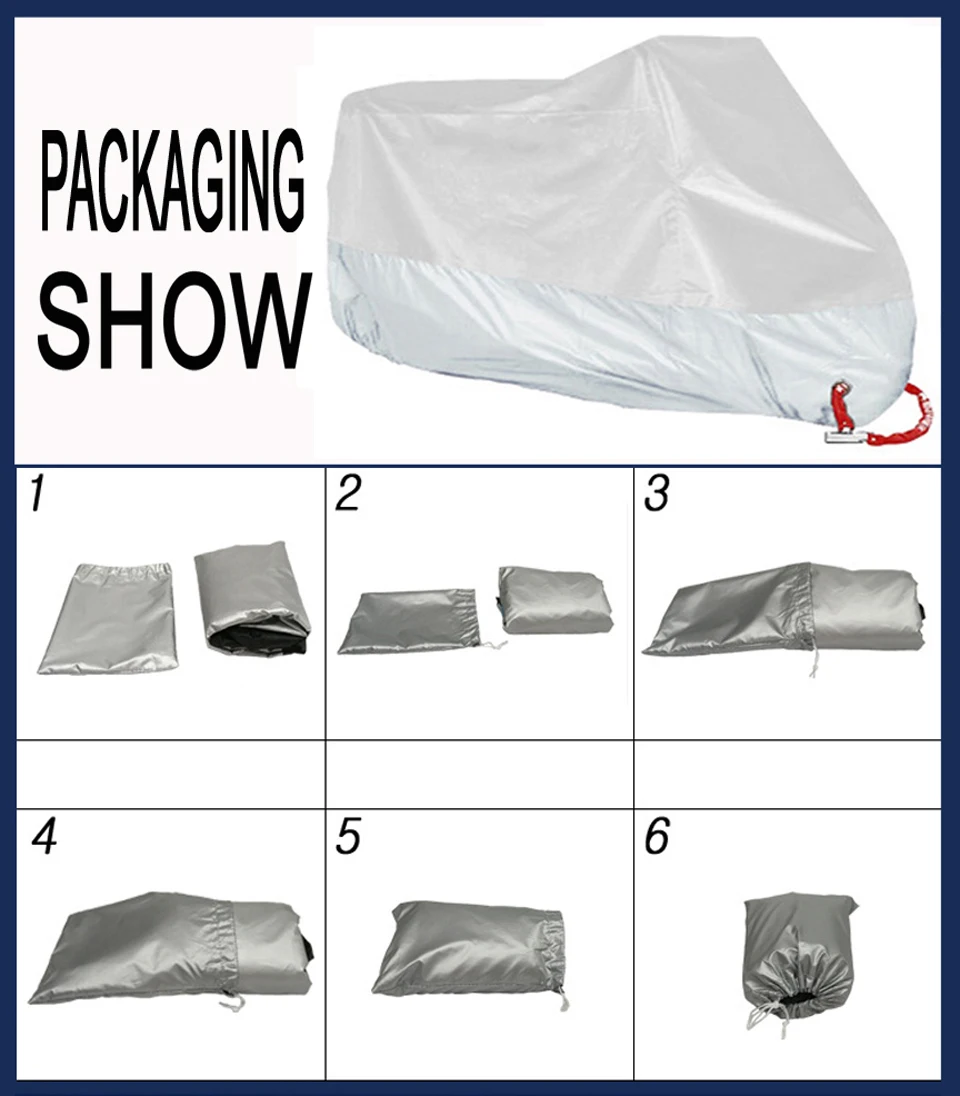 1. Использует улучшенную покрытие серебристого цвета полиэфирная тафта 190T материал, этот материал особенность светильник вес, высокая прочность, защита от ультрафиолетовых лучей, солнца, блок, защита от пыли. 2. Используя эластичность в нижней части чехла, можно плотно прикрыть, не беспокойтесь о том, что крышка поднята ветром, удобная и быстрая, небольшой объем и легко носить с собой, более гуманизированный, чем традиционный дизайн замка или веревки. 3. Особенно подходит для большой температуры, долгое время не стареет в холодной среде, может предотвратить Горящее солнце хорошо, Отличная защита для вашего мотоцикла. Больше не страдать от жары подушки. 4. Серебряное покрытие отражает ультрафиолет высокой прочности, может отрезать УФ-излучение на амортизацию вашего мотоцикла. 5. Защищает ваш мотоцикл от солнца светильник, воды, птиц, деревьев, пыли и грязи 6. Подходит для использования в помещении и на улице 7. Подходит для всех видов мотоциклов, электронных велосипедов, домашнего оборудования и так далее.