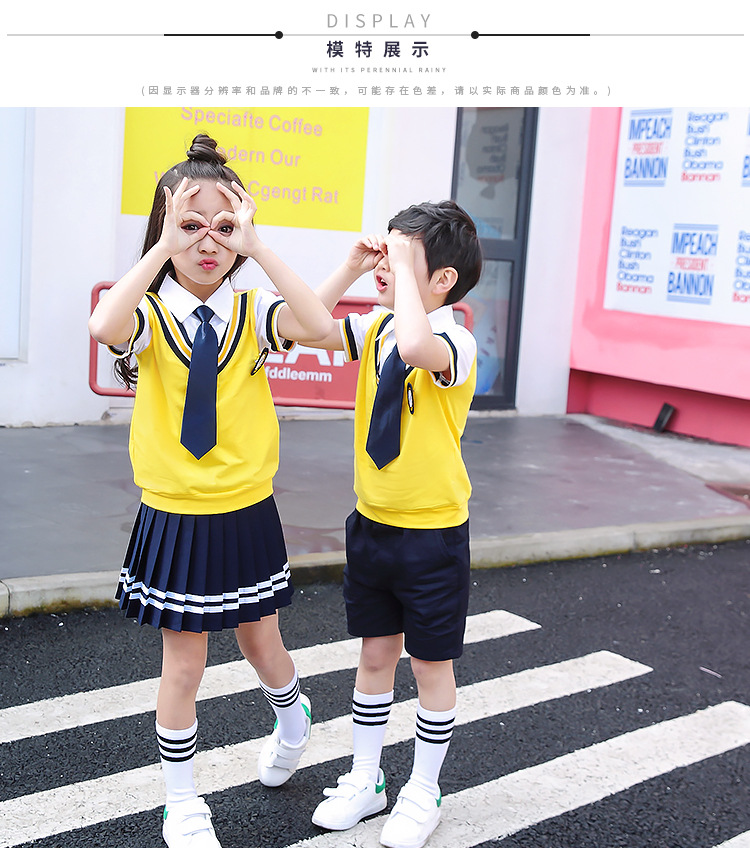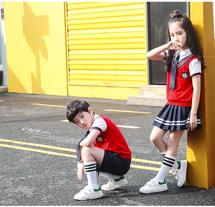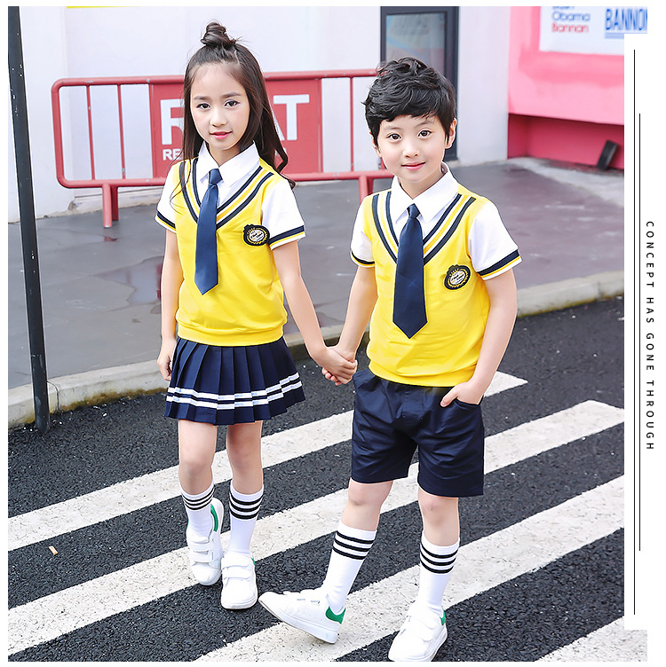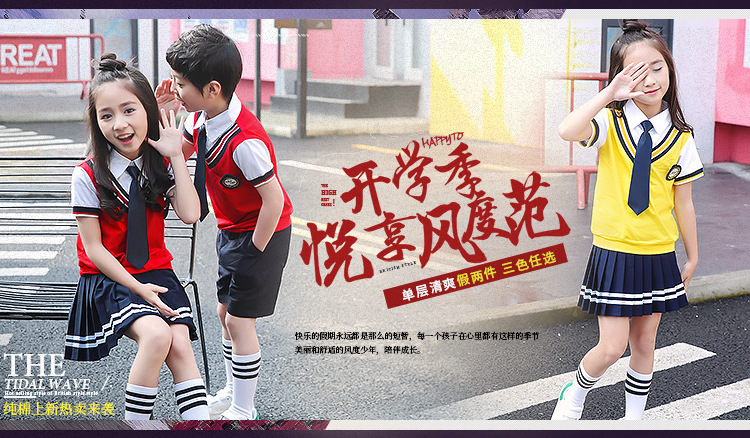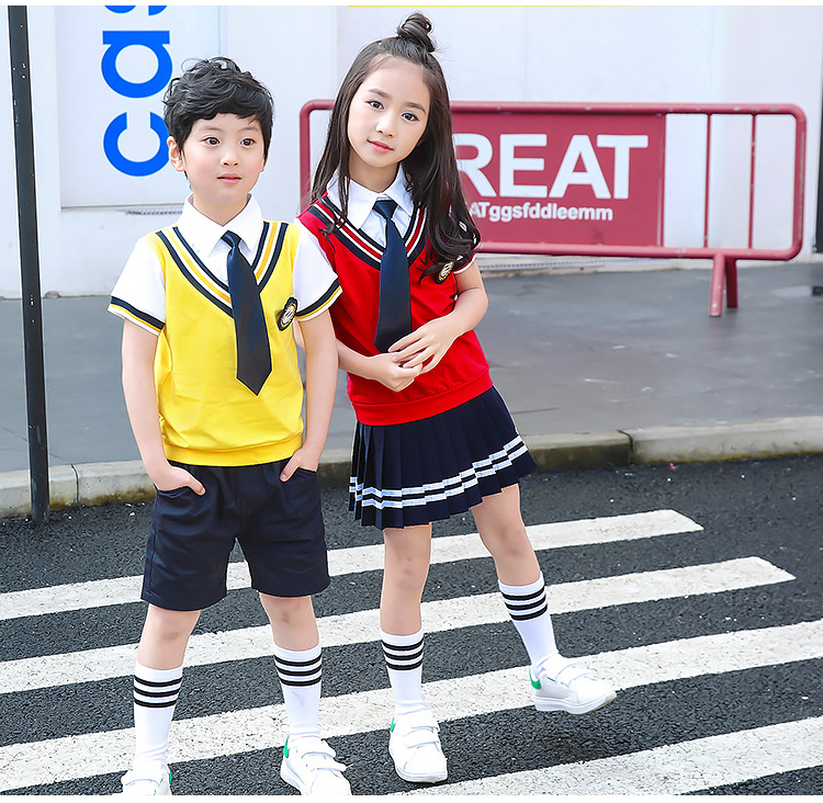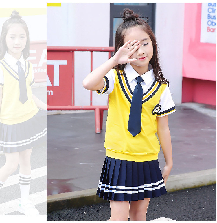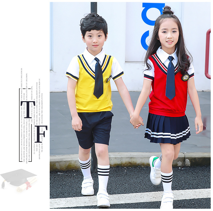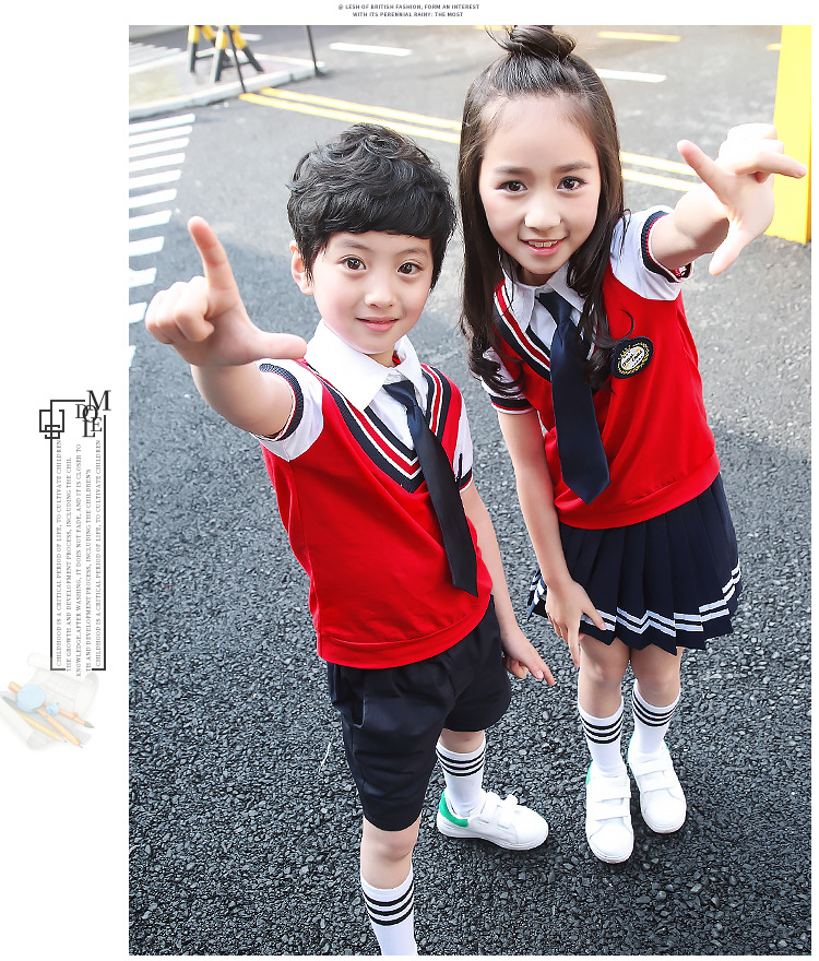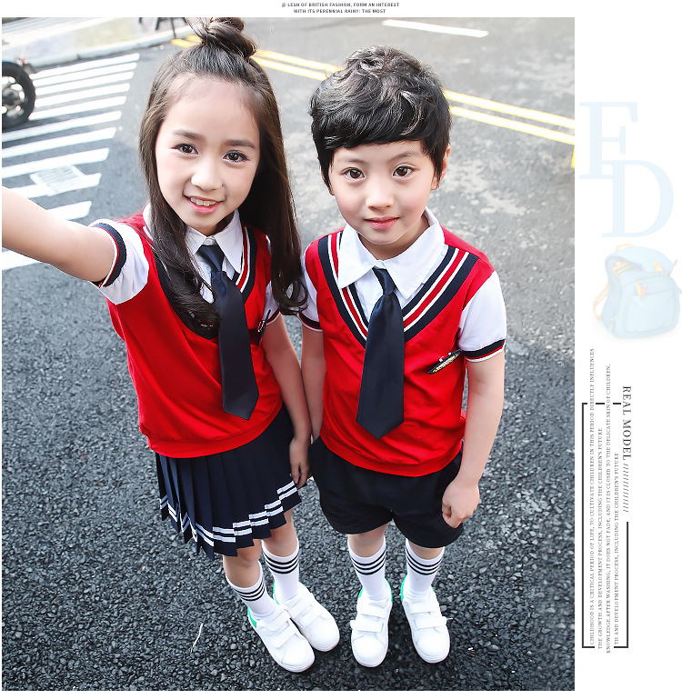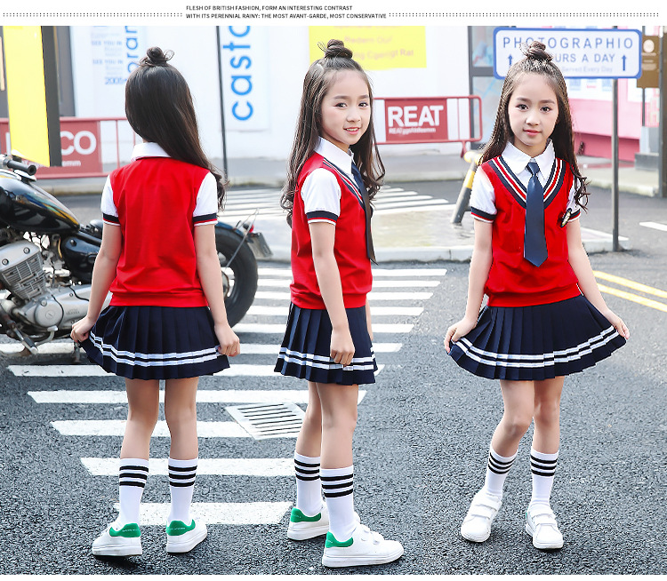 Для девочек костюмы включают в себя:Жилет+ Рубашка + галстук-бабочка + значок + платье