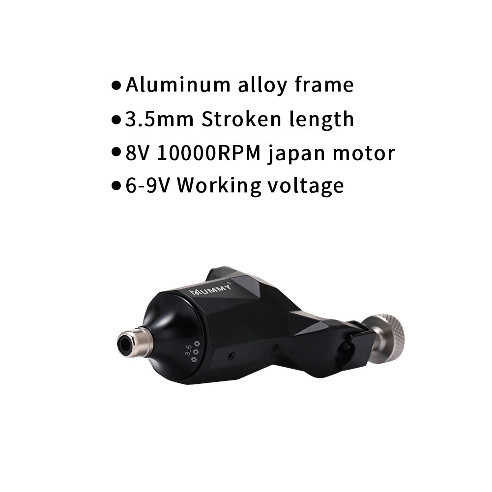 Роторная тату-машина Материал: алюминиевый сплав . Разъем RCA . Начальное напряжение составляет 4 в, рабочее напряжение-6-8 в, обратите внимание, что Максимальное рабочее напряжение должно быть в пределах 10 в, более 10 в двигатель легко нагревается и поврежден, и это уменьшит срок службы двигателя . Роторная Татуировка пистолет принимает 8V 10000RPM японский двигатель, с низким энергопотреблением, но больше энергии . Тату-машинка использует ползунок для вождения, при этом длина хода 3,5 мм независимых передачи иглы без резинкой и независимых изгиба полюс силы иглы более стабильным . Чистая Вес 184 г Посылка: одна роторная машина + один RCA зажим