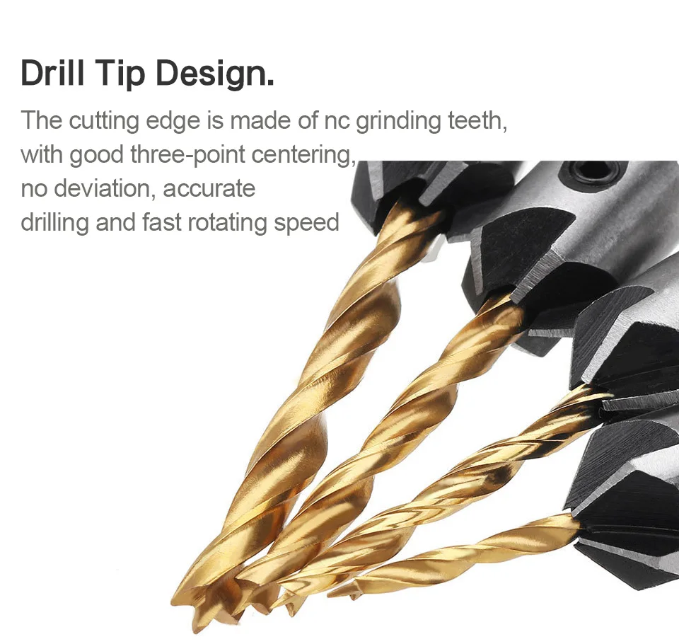 Высокоскоростной стальной материал, хорошая прочность, высокая прочность. Регулируемая глубина рукава с гаечным ключом Сверло и столешница для деревянных винтов без изменения бит. Пятикратный фаски при использовании процесса может быть быстрым разрядом опилок, одноразовые гладкие просверленные столешницы с винтовой крышкой, идеально встроенные в поверхность.