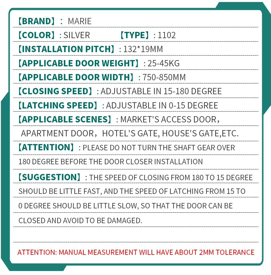 Регулируемая скорость закрытия-Не беспокойтесь о том, что вас поймают за дверь и громкий шум закрытия.-Закрывайте и закрывайте дверь безопасно.