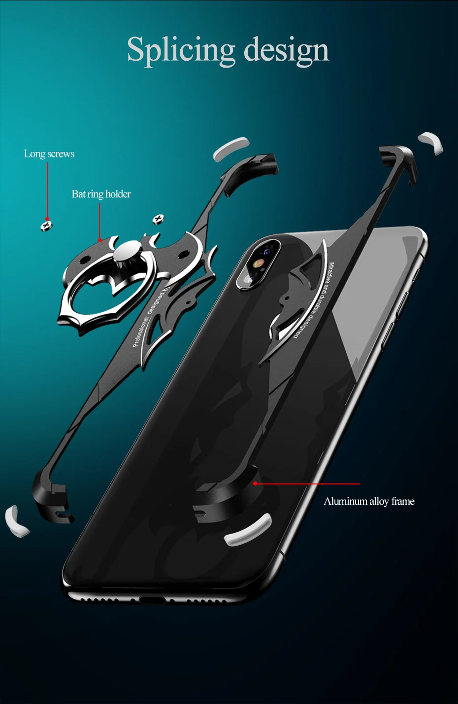 1, инновационная структура, легко разбирается, делает установку более интересной 2, сигнал не мешает, дизайн угла полый, не влияет на сигнал 3, задняя часть полностью выдолблена, не влияет на рассеивание тепла 4, для защиты объектива камеры, чехол для телефона изготовлен из 0,5 мм выпуклая, чем камера, которая действительно защищает линзу от износа. 5, анти-падение, множественная защита, силиконовые подушки безопасности на четырех углах, анти-падение, съемный 6, устойчивый к царапинам внутренний слой, буфер EVA внутренний слой, лучше защитить ваш мобильный телефон 7, вращающийся на 360 ° мобильный телефон с кольцом, форма летучей мыши, более модный