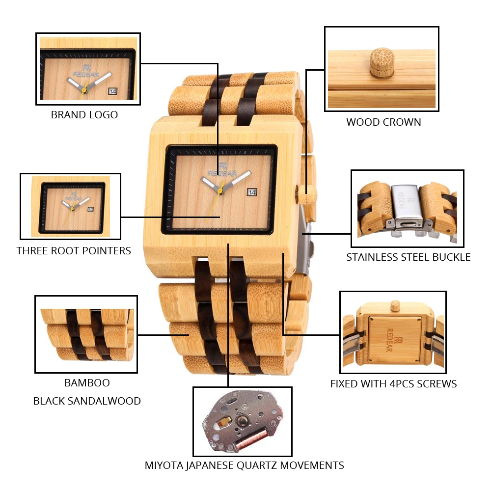 Бренд: REDEAR Модель: SJ1525-1 Корпус часов: кленовое дерево Механизм: кварцевый Miyota Ремешок для часов: кленовое дерево Пряжка для часов: застежка на браслет Стекло: минеральное Стекло Диаметр стекла: 42 мм Вес: 61 г (вес не включает коробку) Водонепроницаемый: Повседневная носка Водонепроницаемый