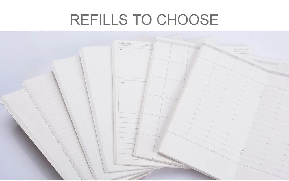 Обычно они пустые x1, правила x1, сетка x1. Но у нас есть 5 типов вкладышей для ноутбука размером A5, вы можете связаться с нами, чтобы изменить его или непосредственно оставить сообщение на рамке Примечания при оформлении заказа. Чтобы увидеть больше деталей пополнения ноутбука, нажмите на картинку. Кстати, записная книжка формата A5 не имеет ежедневных, еженедельных и ежемесячных записей.