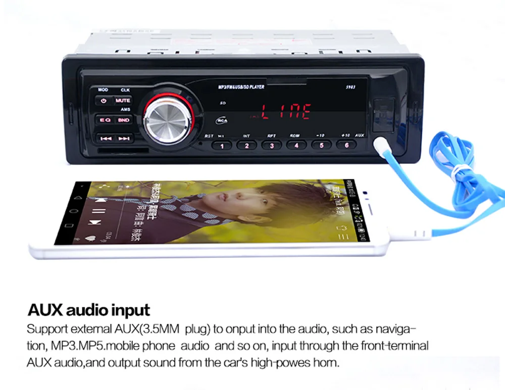 5983 Автомагнитола оснащена AUX-радио пресетами для всех ваших любимых станций. Если ваша Дорожная Поездка требует ваших собственных мелодий, просто подключите мобильные телефоны, или MP3 плеер в передний вспомогательный вход, чтобы играть свою любимую музыку мгновенно. Для тех, кто предпочитает карту памяти SD или USB флеш-накопитель для хранения музыки, просто вставьте устройство в слот.