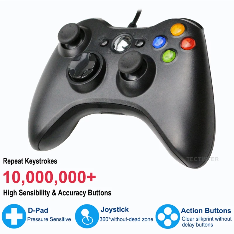 Этот геймпад может поддерживать консоль xbox 360. Два триггера точки нажатия, два мотора с виброответчиком и 8-позиционная стрелка помогают вам сохранять контроль, и игрок чувствует себя так, как будто он находится на поле битвы. Центральная кнопка «Домой» в центре проводного геймпада обеспечивает быстрый доступ к вашим цифровым фильмам, музыке и библиотекам игр.