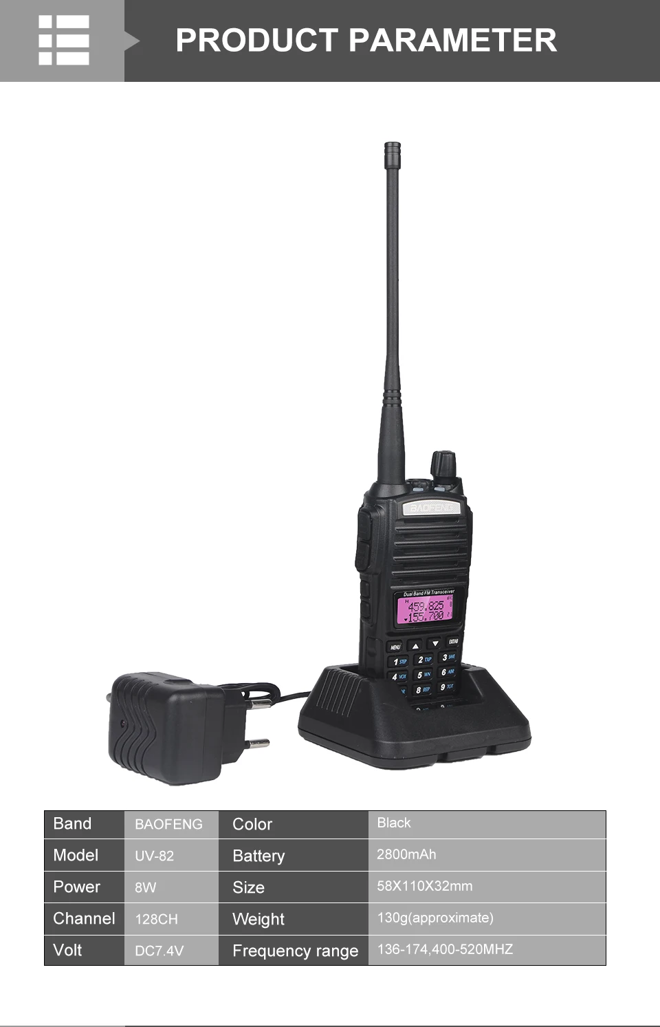 Посылка включает в себя: 2 Радио Baofeng UV-82 2 X Антенна 2 X литий-ионный аккумулятор 2 X Зарядное устройство 2 х Зажим для ремня 2 X Руководство пользователя Функции: Двойной PTT DTMF кодирования Коммерческий fm-радиоприемник (65 МГц-108 МГц) Включает 105 DCS и 50 CTCSS Функция VOX Функция сигнализации До 128 каналов памяти Широкополосный/узкополосный по выбору Высокая мощность/низкая мощность выбор Подсветка дисплея и программируемая клавиатура Функция «звуковой сигнал» на клавиатуре Двойные часы/двойной прием Функция смещения (Смещение частоты для доступа ретранслятора) Батарея функция энегросбережения Программируемый таймер передачи "TOT" Выберите режим сканирования Функция блокировки "BCLO" Встроенный RX CTCSS/DCS sca Встроенный светодиодный фонарик Программируемый ПК Порог уровня «щель» регулируется от 0 до 9 Crossband прием Тон конец передачи Встроенный замок для ключей