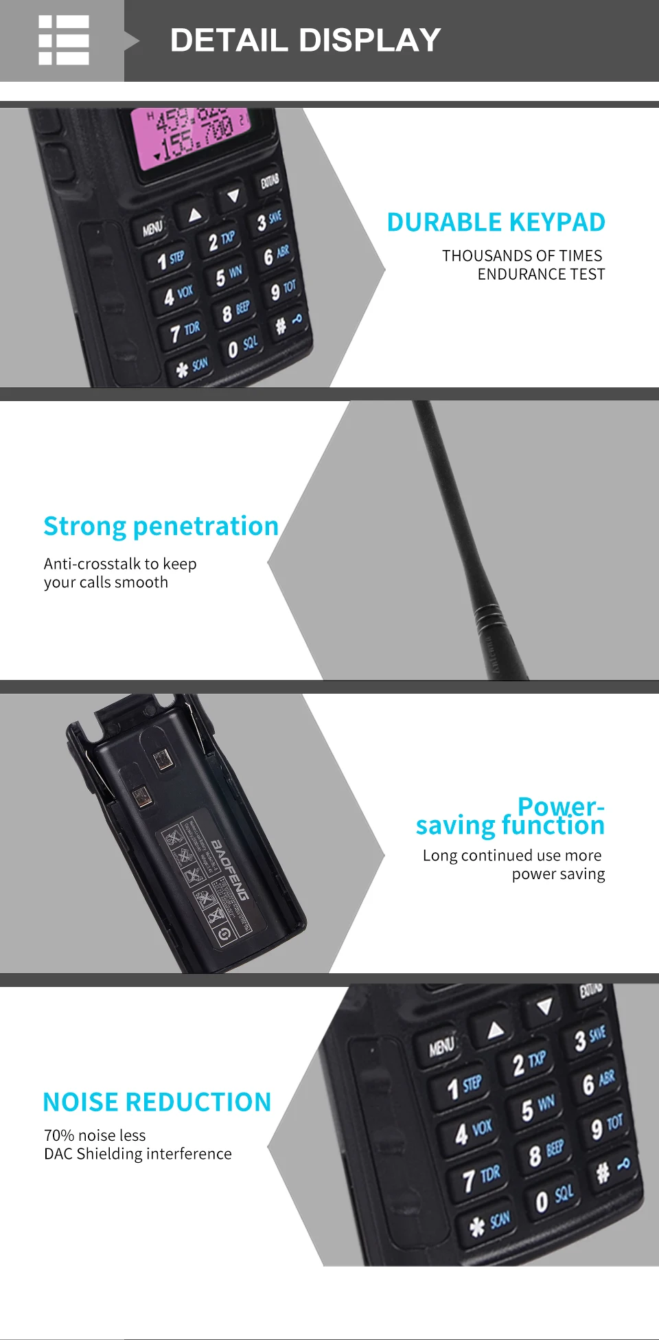 Радиоприемники серии UV-82 также имеют более прочный корпус, который использует большие кнопки, а также по сравнению с предыдущей серией BAOFENG. UV-82 Max использует новейший набор микросхем BAOFENG и печатную плату, которая превосходит диапазон, точность и вывод предыдущих чипсетов BAOFENG