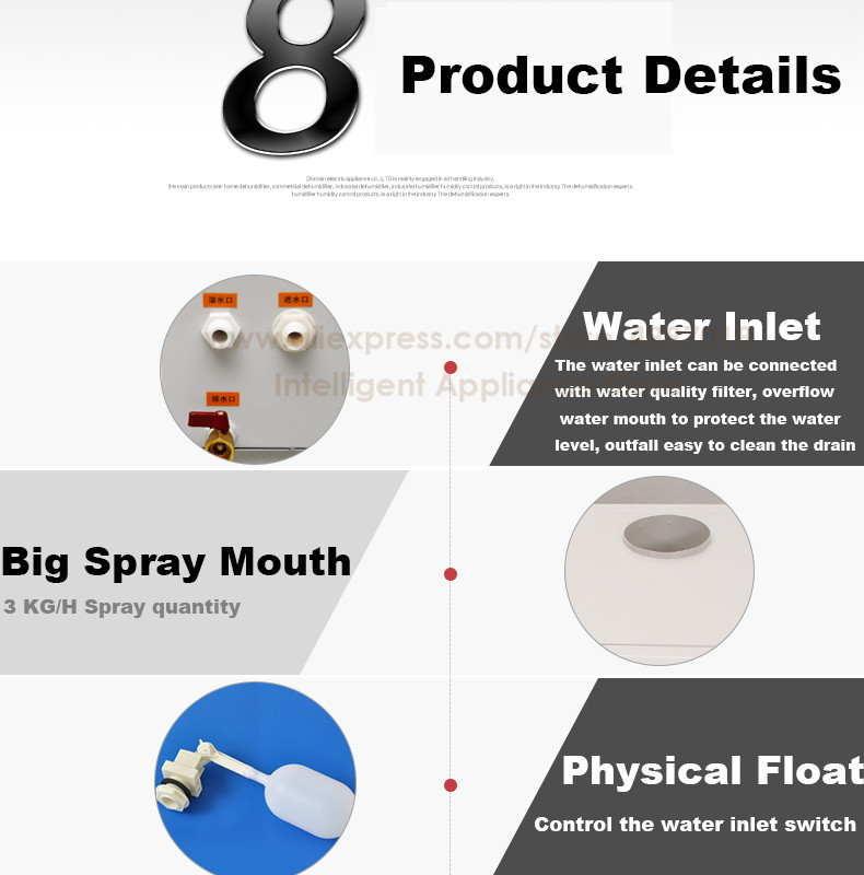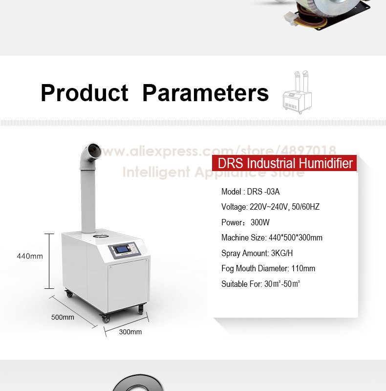 Модель: DRS-03A Источник питания: 220 В ~ 240 В, 50 Гц/60 Гц Мощность: 300 Вт Емкость увлажнения: 3 кг/ч Область применения: 30 ㎡-50 ㎡ Размер машины: 440 мм * 500 мм * 300 мм Размер тумана: 110 мм Емкость резервуара для воды: Тип доступа для водопроводных труб Модель управления: автоматическое управление/ручное управление Защитное устройство: источник питания с защитой от утечки