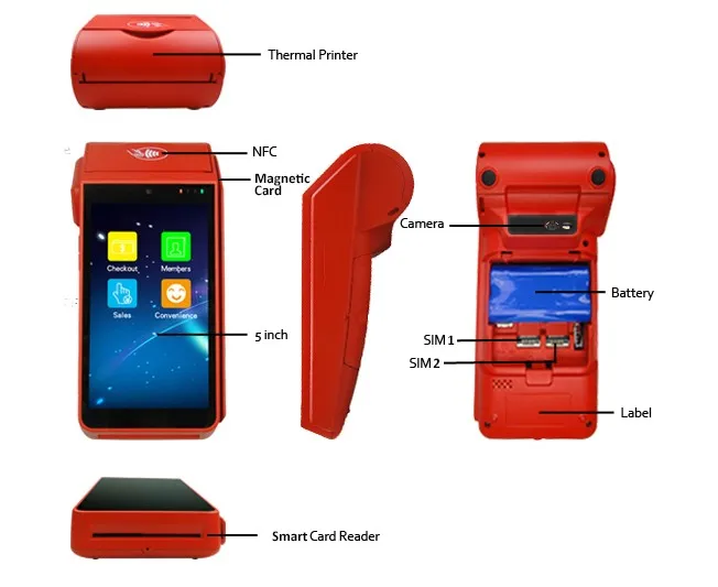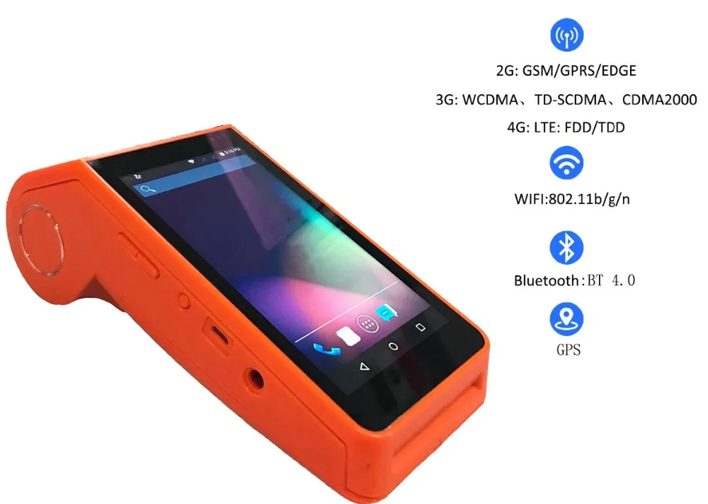 Ключевые особенности:-Подключение через WIFI,4G,3G,GPRS, SMS, bluetooth-5 дюймов сенсорный экран-ОС android 5,1, 8 Гб RAM, 64 ГБ flash-Батарея работает 8-10 дней в режиме ожидания-NFC, считыватель магнитных/смарт-карт, камера (опционально)-Бесплатный SDK-Бесплатное приложение для управления онлайн-заказами продуктов питания