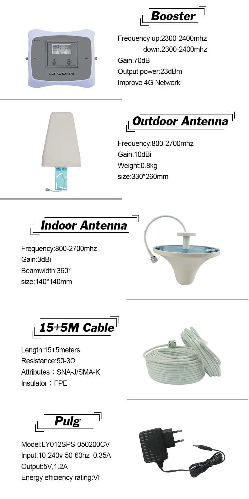 1. Умный ЖК-дисплей, показывает силу сигнала в реальном времени. 2. С функцией ALC/AGC Можно контролировать усиление автоматически. Избегайте установки внутри базовой станции помех 3.(полоса 40) 2300 МГц -- частота подключения: 2300-2400 МГц/частота нисходящего канала: 2300-2400 МГц 4. Полный комплект с антеннами и кабелем, простая установка. 5. Тип разъема: SMA-female. 6. Режим сна. Интеллигентая (ый) экономное потребление энергии.