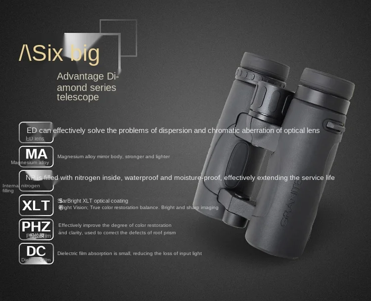 Гранитные бинокли имеют ED Стекло в оптической конструкции. Они обеспечивают края до края резкость с отличной коррекцией цвета и резкими изображениями бритвы, практически устраняя хроматические аберрации.