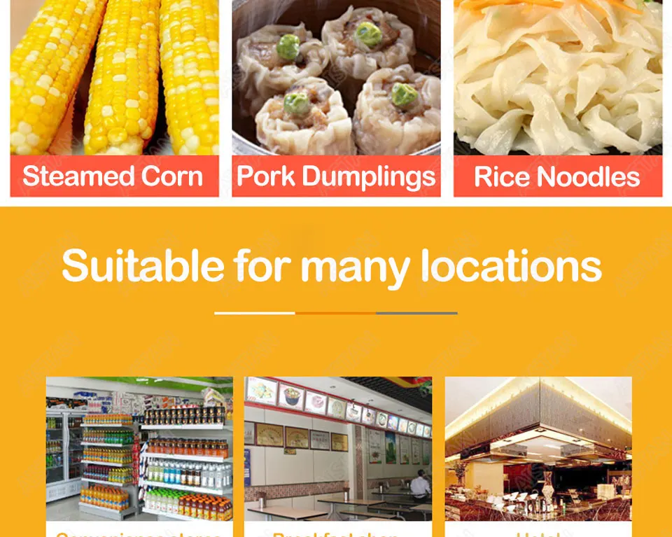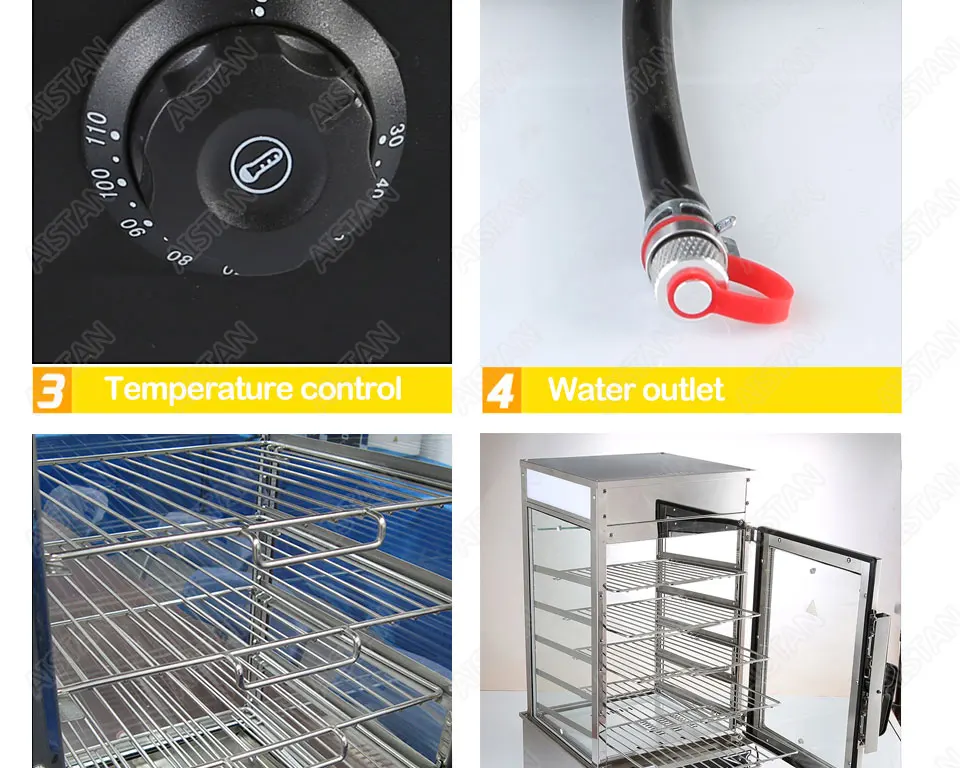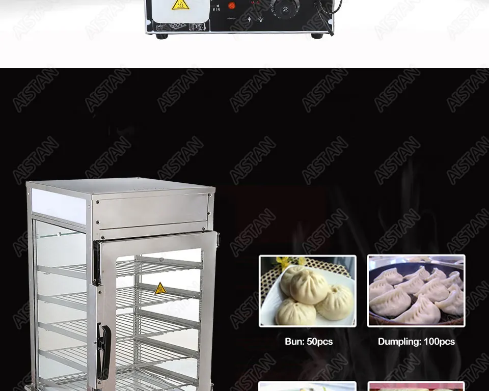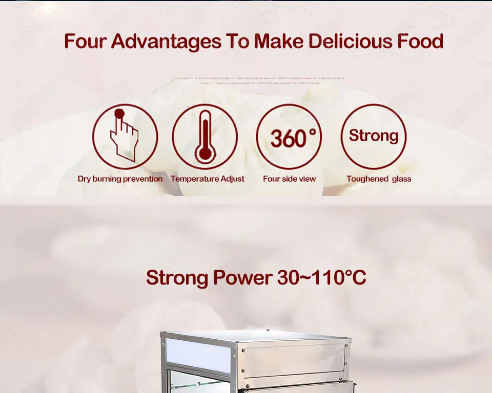 1. Пищевой корпус из нержавеющей стали, безопасный, здоровый и не ржавый. 2. Четырехстороннее полое закаленное стекло, встроенный нанометр молекулярного осушения сита. Полое закаленное стекло, которое также может предотвратить рассеивание тепла, энергосбережение. 3. С дизайном всех прозрачных очков, вкусные продукты внутри так привлекательны с любого угла. 4. Полностью открытый верхний светильник с блестящей лампой, которая идеально подходит для рекламы, вы можете сделать все, что вам нравится. 5. Высокоэффективный нагревательный элемент с автоматическим контролем температуры. Быстрое нагревание, производство пара на 80 С. 6. Встроенное устройство безопасности, которое может защитить машину от нехватки воды. Предотвращает сухое нагревание, надежная производительность. 7. Полки для пищевых продуктов, безопасные и здоровые. Не беспокойтесь о непосредственном контакте с едой. 8. Большая емкость. 5 слоев, которые могут работать с 80 булочками диаметром 7 см. 9. Многофункциональность для широкого спектра продуктов питания. Он используется для кондитерских изделий, булочек, хлеба на пару, пельменей, пирожных и натоптышей и т. д. 10. 5 л большой резервуар для воды. Встроенная функция предварительного нагрева, которая экономит больше энергии и энергии. 11. Большая защита от пыли, защита резервуара для воды, здоровая и безопасная.