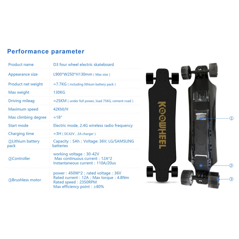 1. Мне нужно оплатить таможенную пошлину?Налог будет предоплачен испанским складом, когда вы получите посылка, вам не нужно платить налоги.2. Сколько времени займет доставка после заказа?Страны ЕС около 4-7 дней доставки; Испания около 2-5 дней доставки3. Это оригинальный скутер?Мы обещаем, что этот скутер 100% оригинальный бренд Koowheel4. Что делать, если я не доволен товаром?Мы гарантируем, что вы будете на 100% удовлетворены качеством вашего продукта. Если вы недовольны этим, пожалуйста, свяжитесь с нашей службой поддержки клиентов, которая будет рада помочь.При обращении в службу поддержки клиентов, пожалуйста, дайте номер вашего заказа, краткое описание и фото проблемы, чтобы мы могли предотвратить эти проблемы в будущем.5. Могу ли я получить гарантию на ремонт?Один год гарантии магазина (китайский гарантийный сервис) или один год гарантии на склад Испании/Польши, половина года о батарее.Спецификация2-й Электрический скейтборд:Параметры производительности