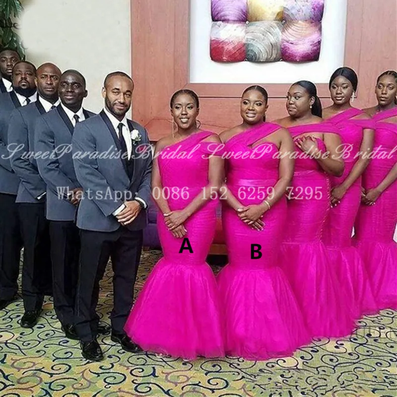 Фуксия Тюль Русалка платья подружек невесты 2020 на одно плечо в африканском стиле женское длинное свадебное платье для вечеринки Vestido De Festa De Casamento в пол индивидуальный заказ на шнуровке сзади