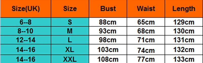 Tag SizeBustLengthWaistS88cm129cm72cmM92cm130.5cm76cmL96cm132cm80cmXL100cm133.5cm84cm2XL101cm135cm88cm