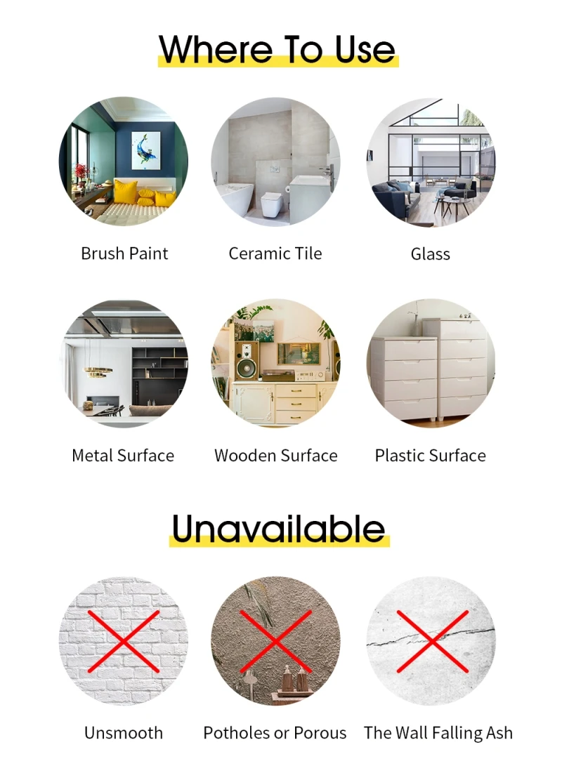 Применяется только на гладкой, чистой и сухой поверхности, также не должно быть пыли и отверстий. (Не для деликатных или текстурированных поверхностей).