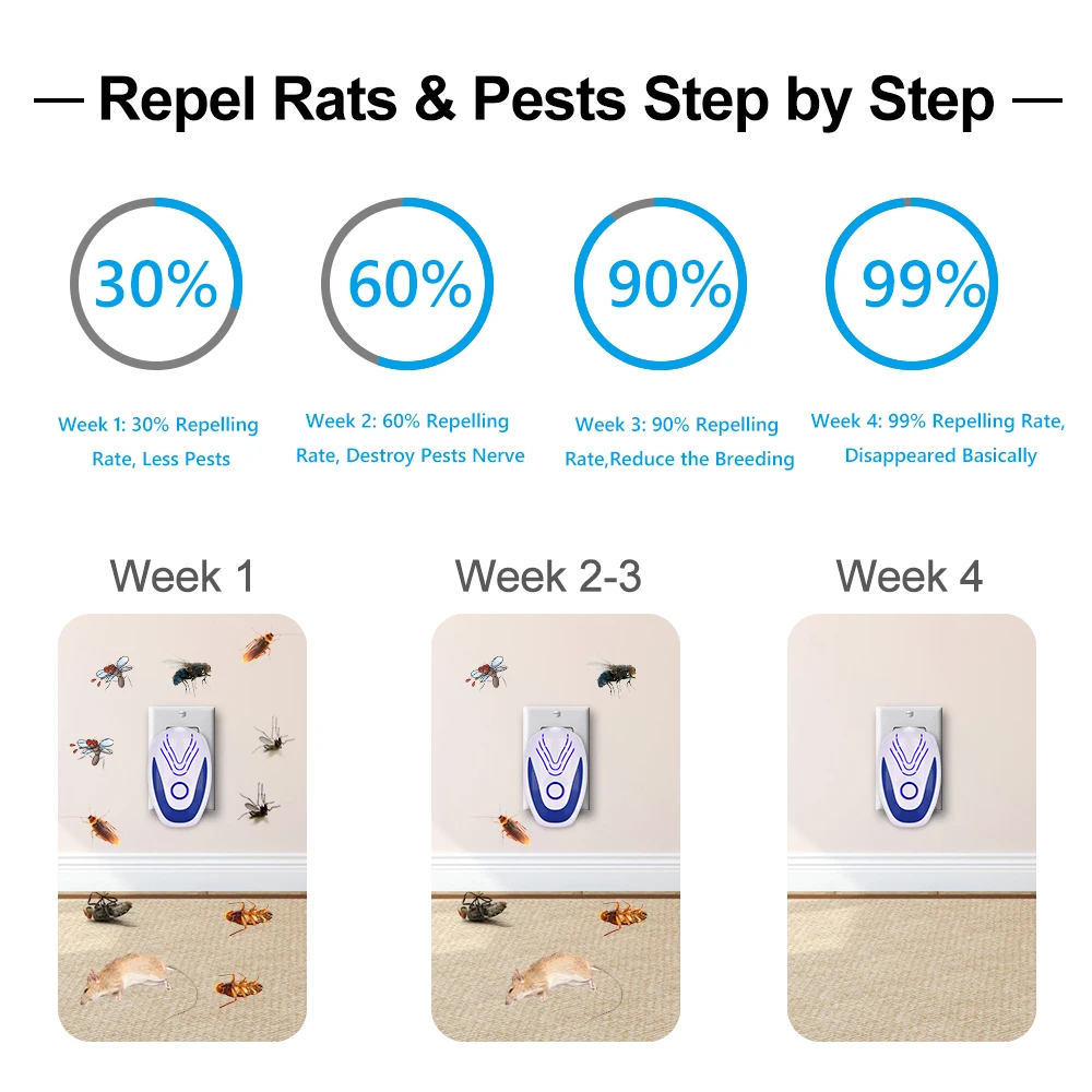 -Новейшая ультразвуковая технология с модернизированным чипом-Применение новейшего ультразвукового чипа, двойная мощность = двойная гарантия, которая обеспечивает более длительный эффект от отталкивания раздражающих вредителей. Репеллент грызунов автоматически изменяет частоту звуков, так что грызуны не могут адаптироваться к любым звукам. Хорошо работает с мышами, тараканами, пауками, клопами, комарами, насекомыми, крысами, грызунами, мухами, муравьями, блохами и другими вредителями.
