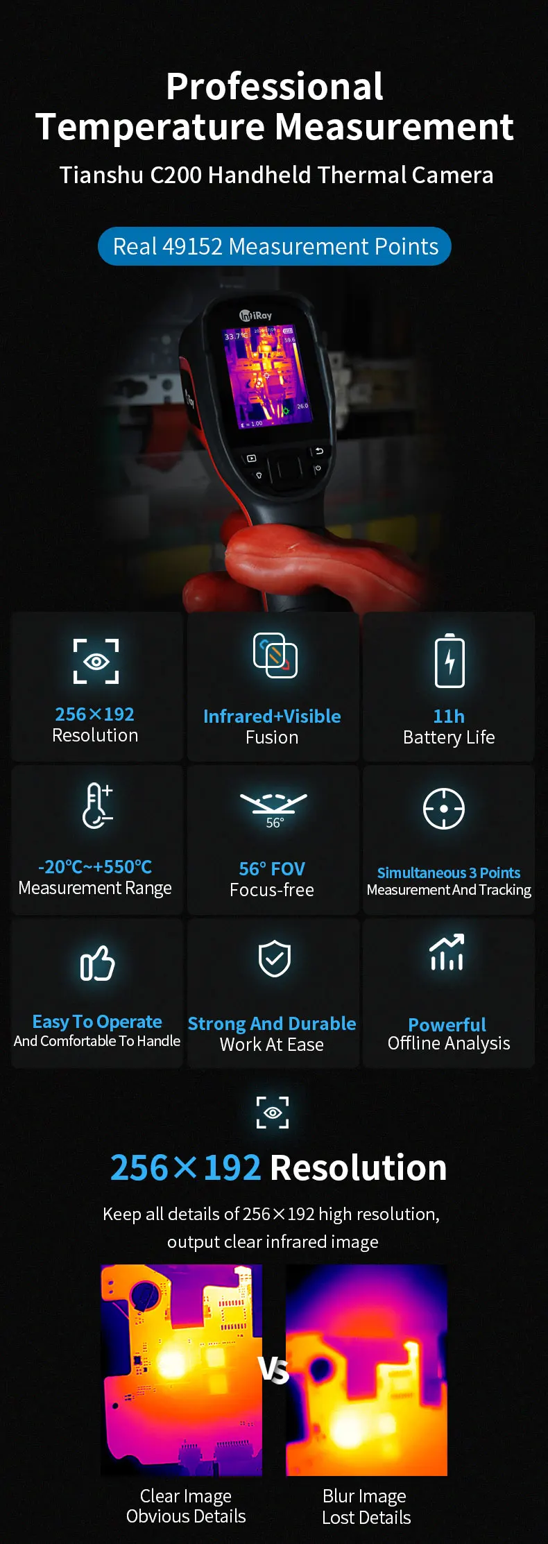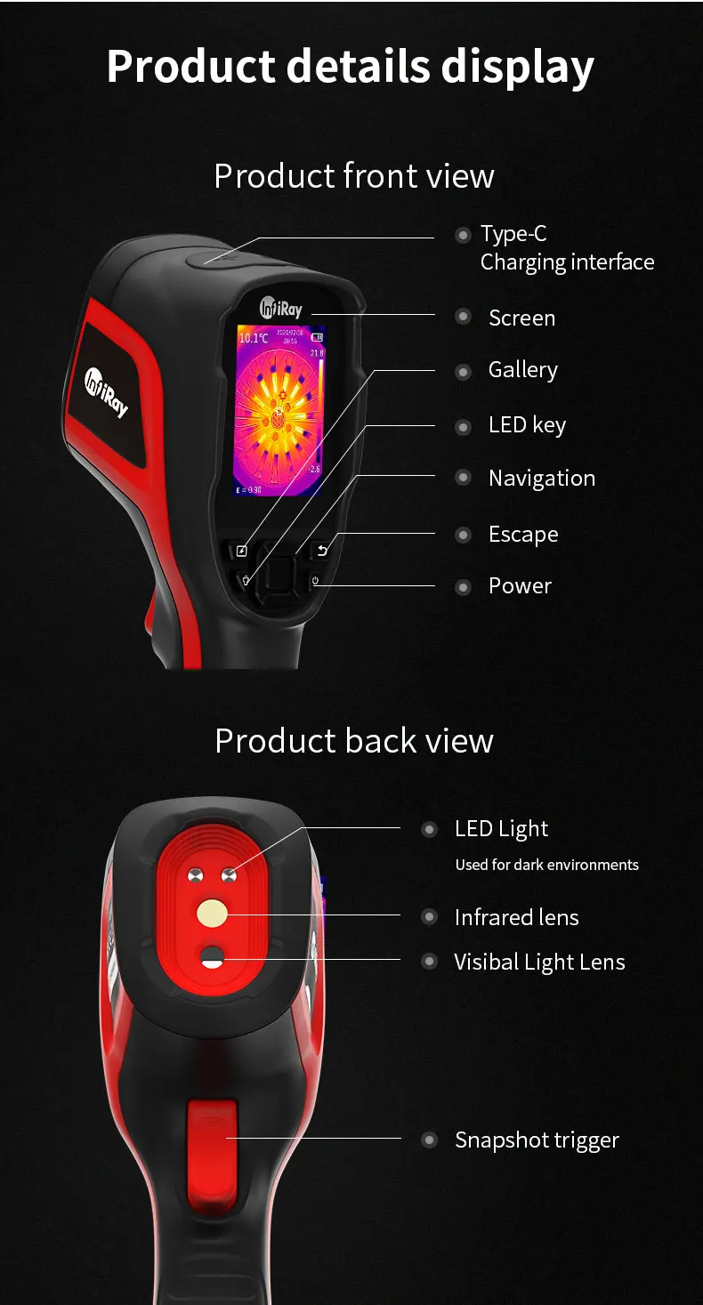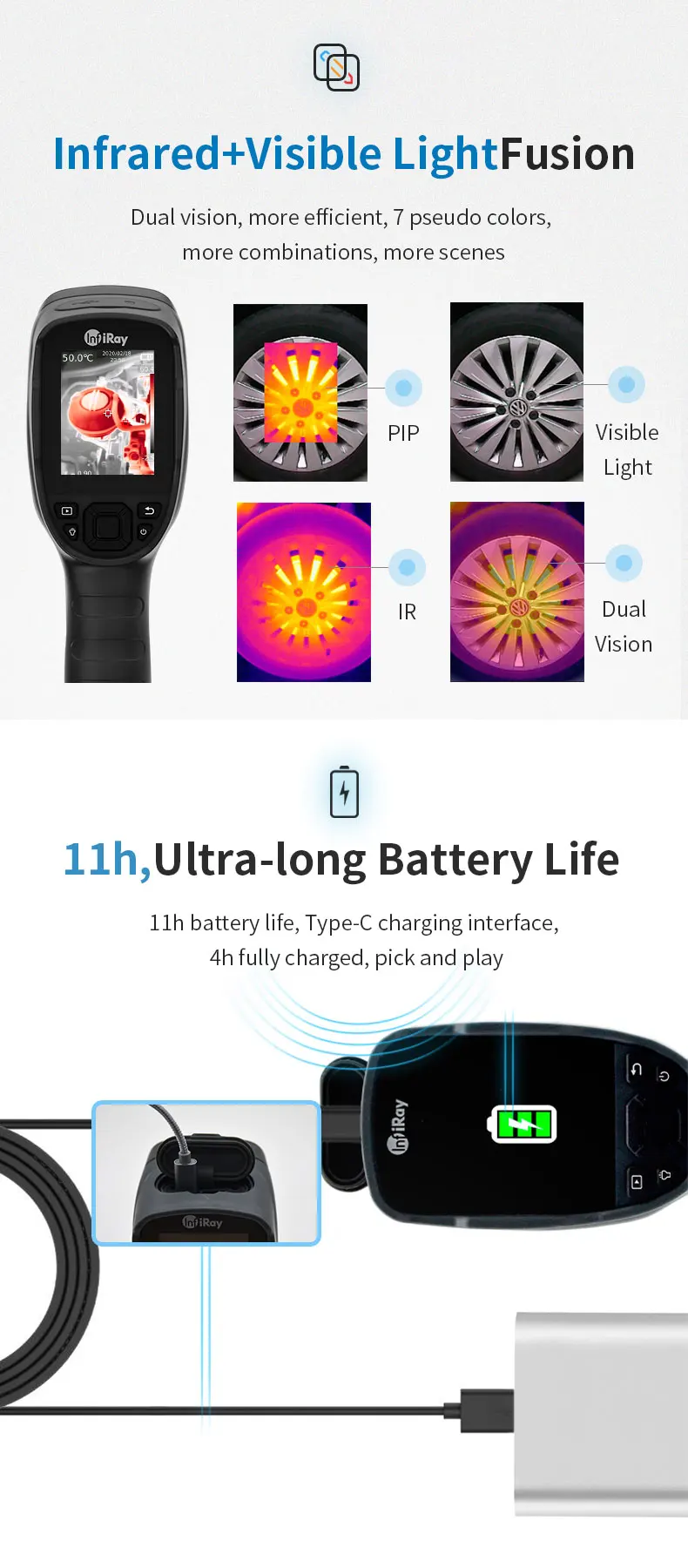 О: это богатая и практичная функция двойного освещения. 256 × 192 инфракрасных пикселей + двойное плавление света, 5 режимов + 7 цветных пластин, до 29 комбинаций, чтобы помочь вам найти проблему как можно скорее.