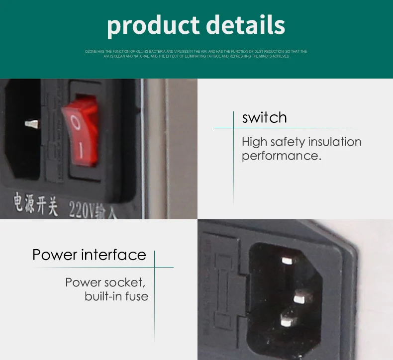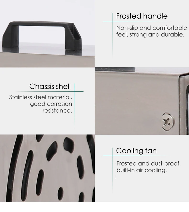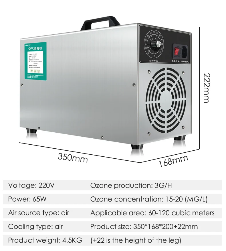 Наименование: машина для дезинфекции озона Модель: XD-803S Вес продукта: 4,5 кг Тип источника воздуха: воздух Тип охлаждения: воздух Производство озона: 3 Гц/ч Мощность: 65 Вт Концентрация озона: 15-20 (мг/л) Применимая площадь: 60-120 куб. М Напряжение: 220 В Размер изделия: 350*168*200 + 22 мм (+ 22-это высота ноги)