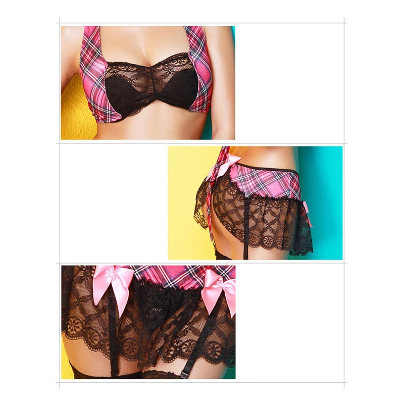 Кружевная сексуальная школьная форма с лямкой на шее, школьная форма для девочек, обтягивающий эластичный сексуальный костюм, костюм с бантом, прозрачная плиссированная юбка, хит продаж, новинка