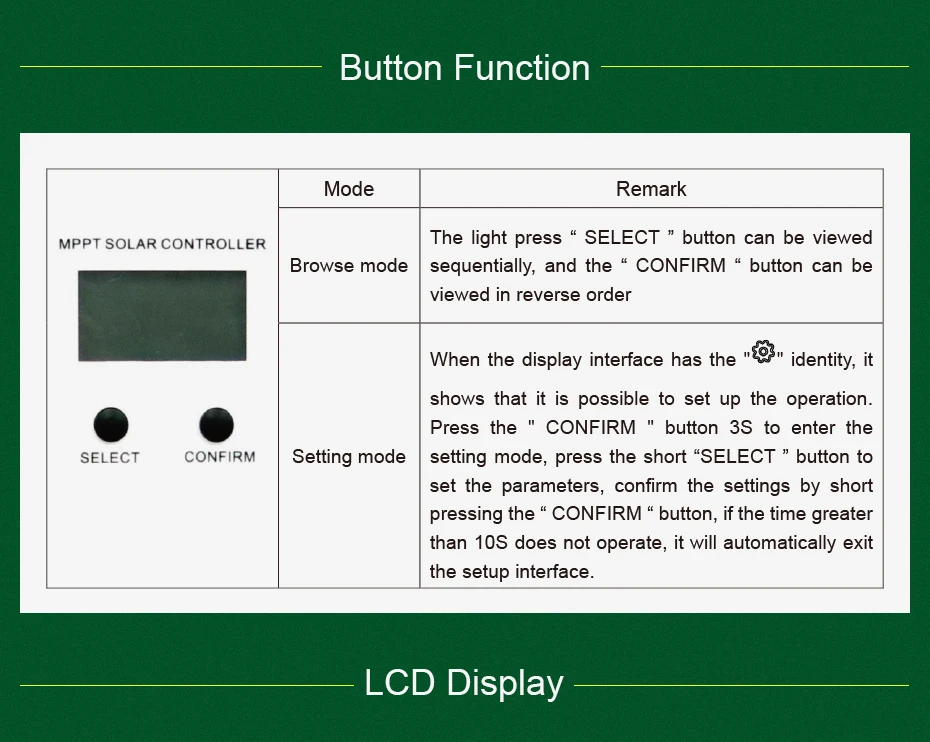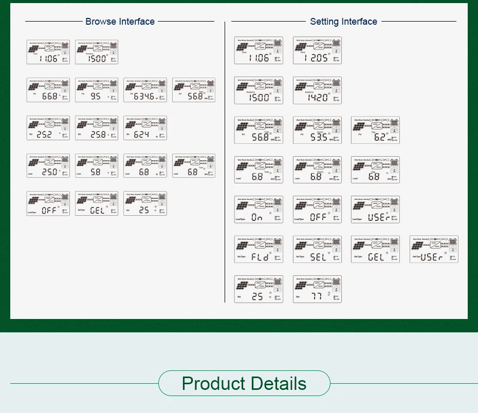 Большая часть информации может быть предоставлена ЖК-дисплеем, таким как: Тип системы, входное напряжение PV, входной ток PV, день/месяц/общая Генерируемая энергия, тип батареи, напряжение батареи, зарядный ток, мощность зарядки, ток нагрузки, мощность нагрузки и так далее;