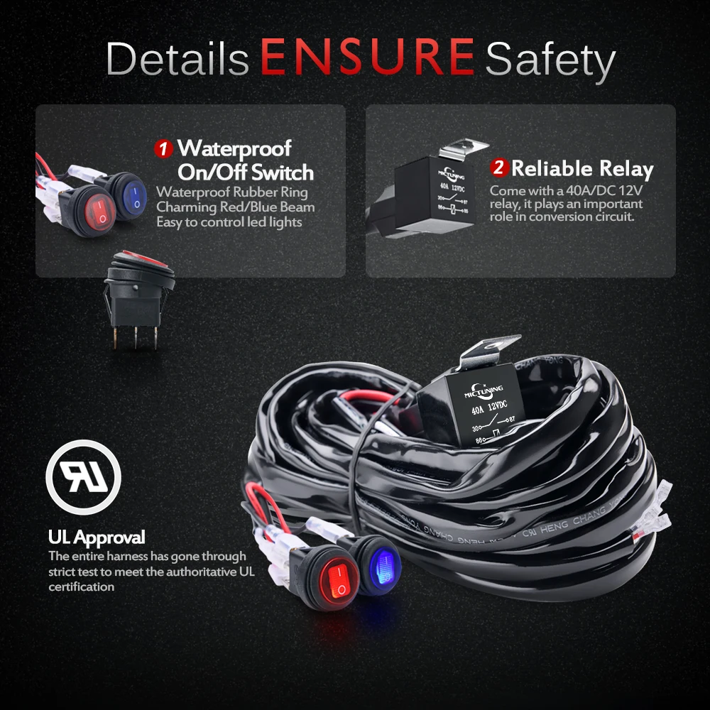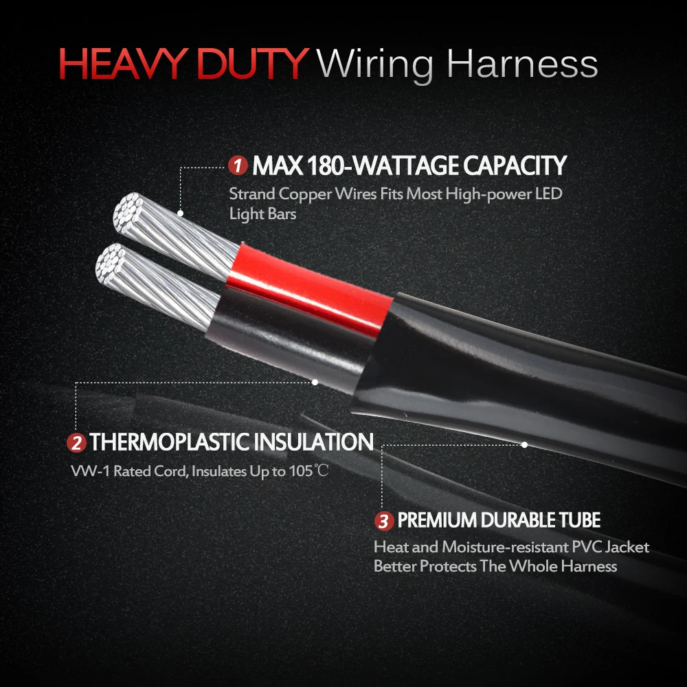 1. Двойного назначения 2-контурный жгут проводов-новый стиль жгут проводов с 2 переключателями, свободно управлять один светодиодный светильник бар с задний светильник или отдельно управления передний и задний светильник s (оба вкл/выкл, один вкл/выкл) 2. Сверхмощные провода-одобрение UL, 16AWG медная проволока премиум класса, медведи макс. 180 Вт Мощные светодиодные фонари, обернутые термопластичной изоляцией ПВХ куртка, термостойкие до 105 ℃ 3. Надежная защита-встроенное реле a 40A и предохранитель лезвия, являясь первой линией защиты, чтобы хорошо защитить весь жгут от перегрузки по току и короткого замыкания 4. Подходит для любой погоды-поставляется с водонепроницаемыми переключателями и плотно прилегающим держателем предохранителей, пыленепроницаемым, защищенным от песка, влагостойким и водоотталкивающим струями 5. Простая установка на 12 В постоянного тока, 10 футов длинных проводов для гибкого крепления в желаемое место. Вы получите 2 Yr MICTUNING ограниченную гарантию, пожизненную техническую поддержку и дружественное послепродажное обслуживание! Внимание: Настоятельно рекомендуется Профессиональная установка