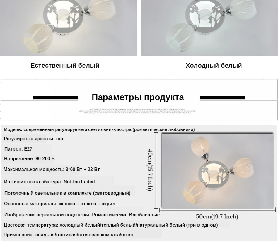 Модель: Современный регулируемый светильник-люстра (романтические влюбленные) Размер: 40 см * 50 см (15,7 дюйма * 19,7 дюйма) Патрон: E27 Напряжение: 220 V Максимальная мощность: 3*60 Вт + 22 Вт Материал абажура: матовое стекло Абажур светильник источник: не входит в комплект Акриловый светильник с рисунком панели: Романтические Влюбленные Потолочный светильник источник: в комплекте (светодиодный чип) Цветовая температура: Холодный/теплый/натуральный белый (три в одном) Уважаемый, эта люстра имеет холодную/теплую/естественную белую 3 цветовую температуру, вы можете включить/выключить люстра, чтобы изменить цвет.